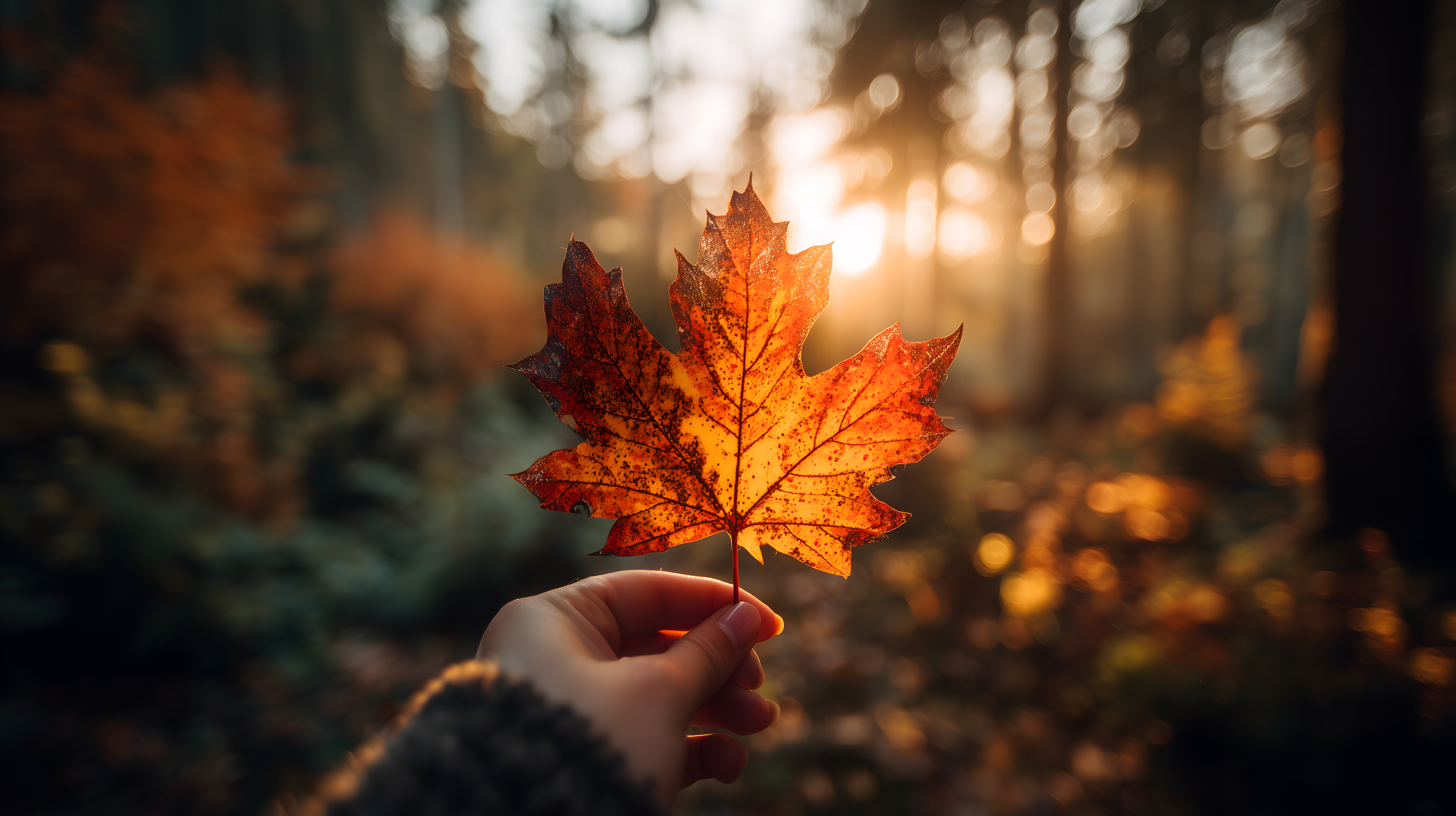 Ahornblatt in Hand vor herbstlichem Sonnenlicht im Wald