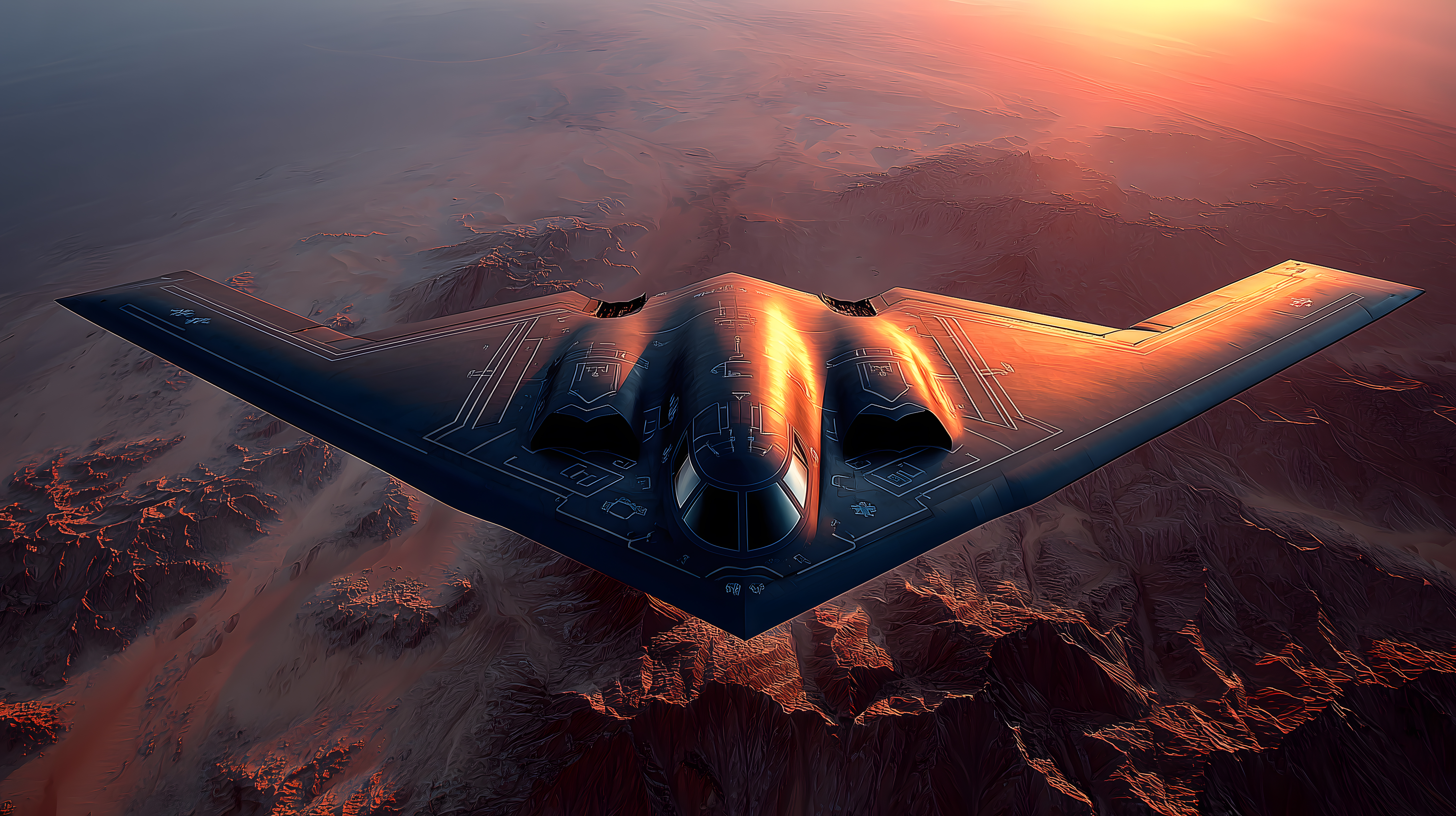 Amerikanischer B2 Tarnkappenbomber fliegt über Wüstenlandschaft im Iran
