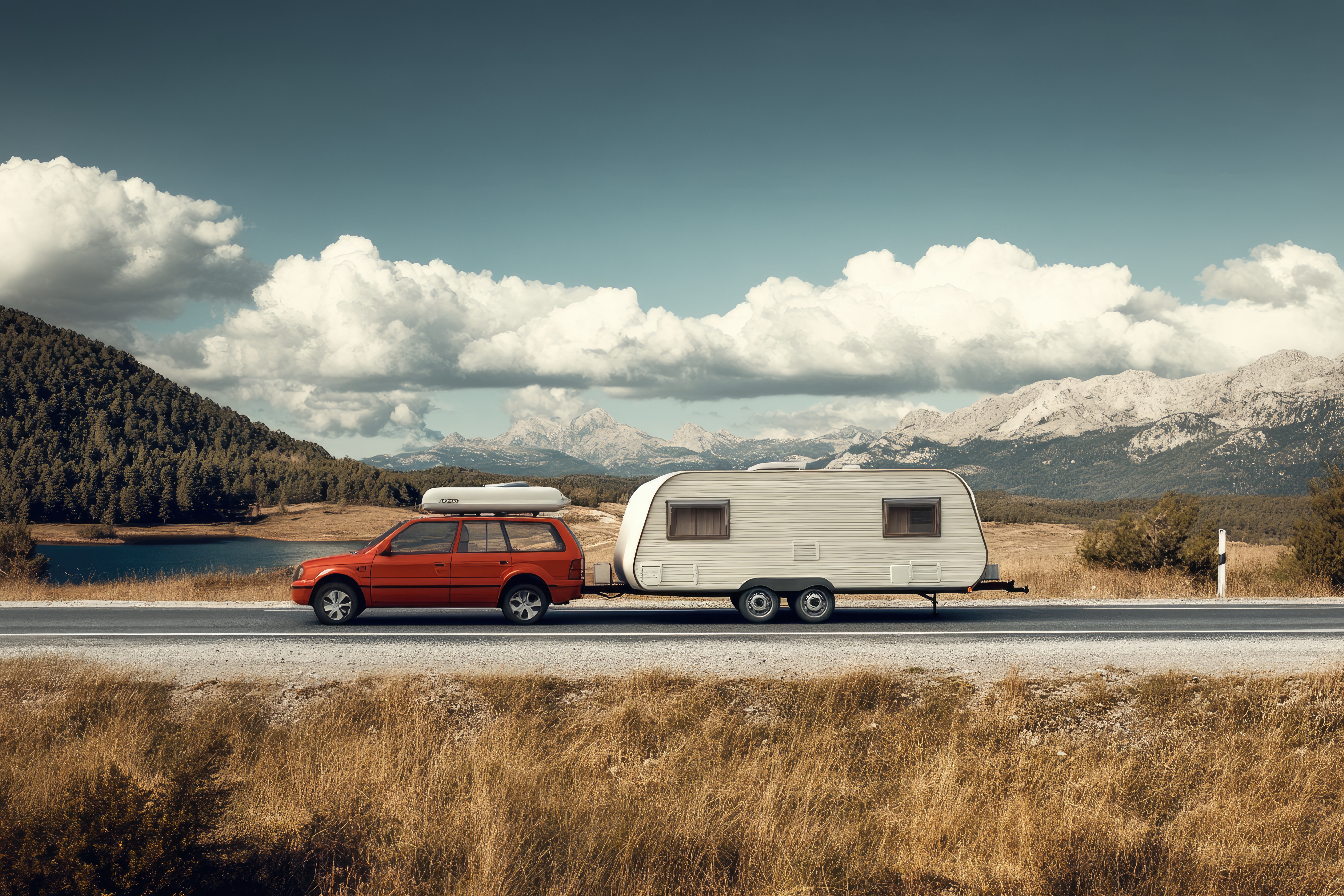 Auto mit Wohnwagen vor den Bergen