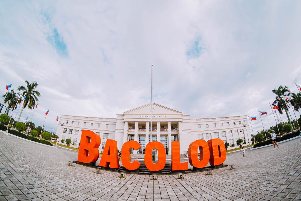 Bacolod in orangefarbener Schrift vor dem Regierungsgebäude in Bacolod City