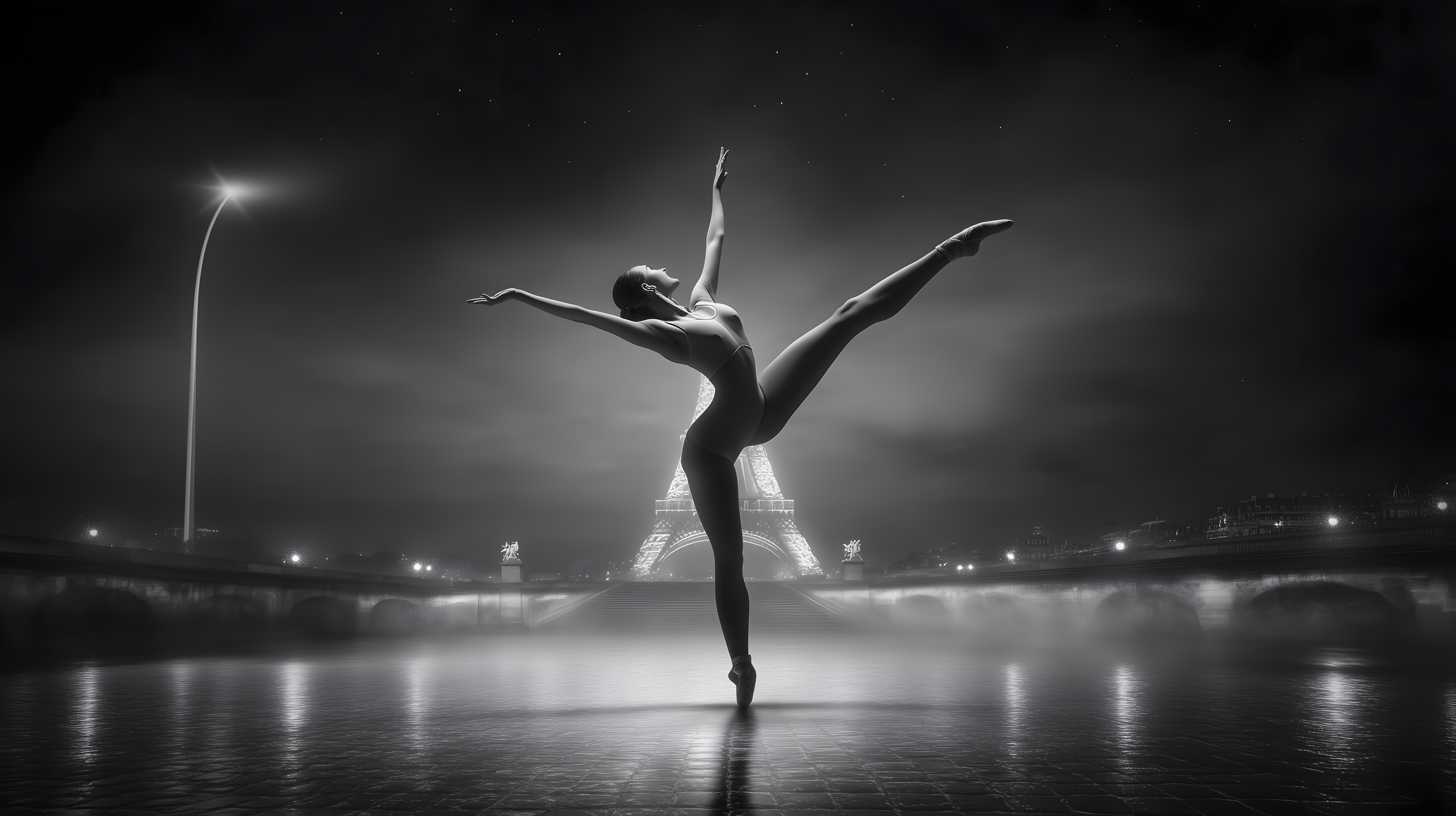 Ballerina tanzt nachts vor dem Eiffelturm in Paris