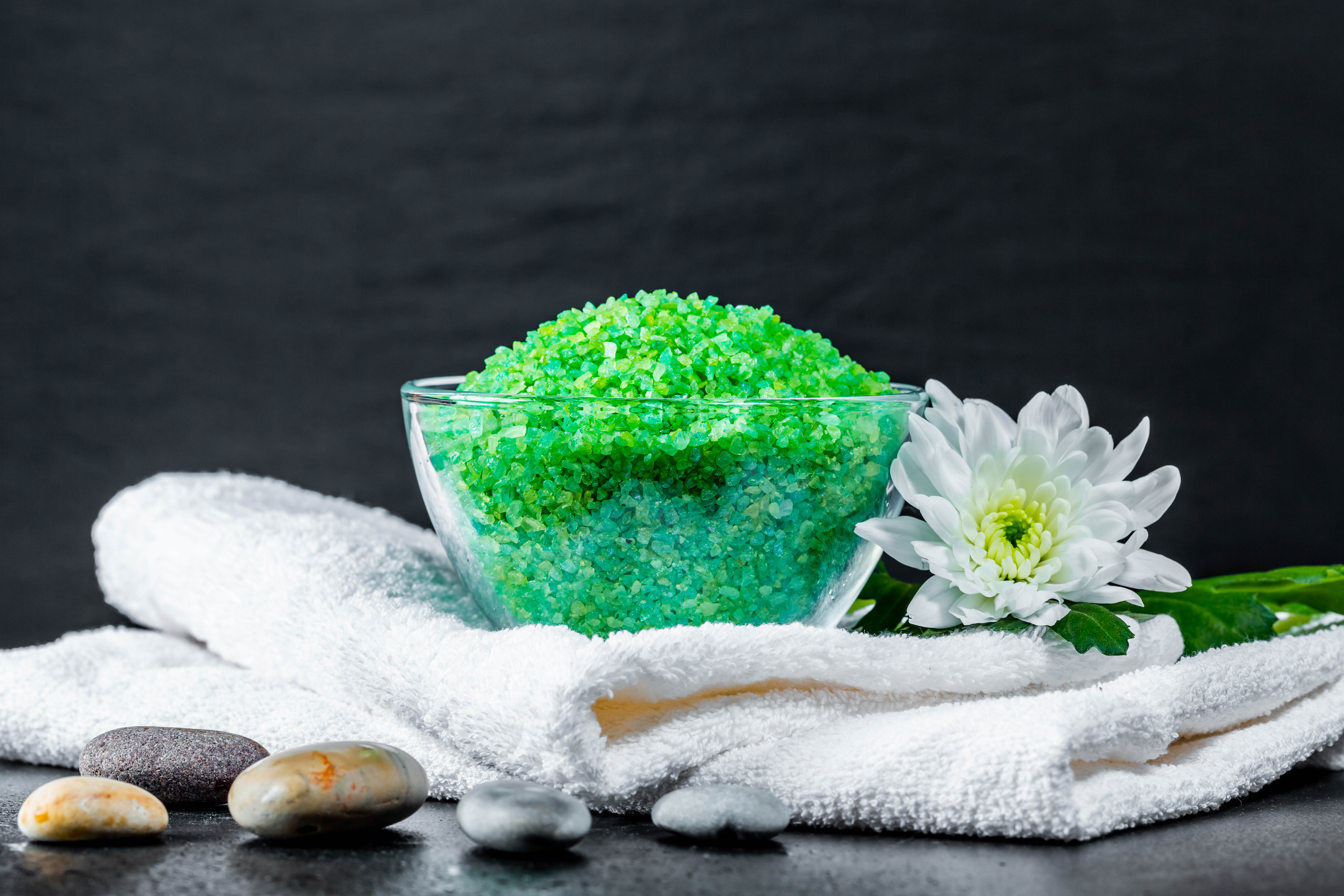 Bath salts and a clean white towel - the concept of a relaxing Spa