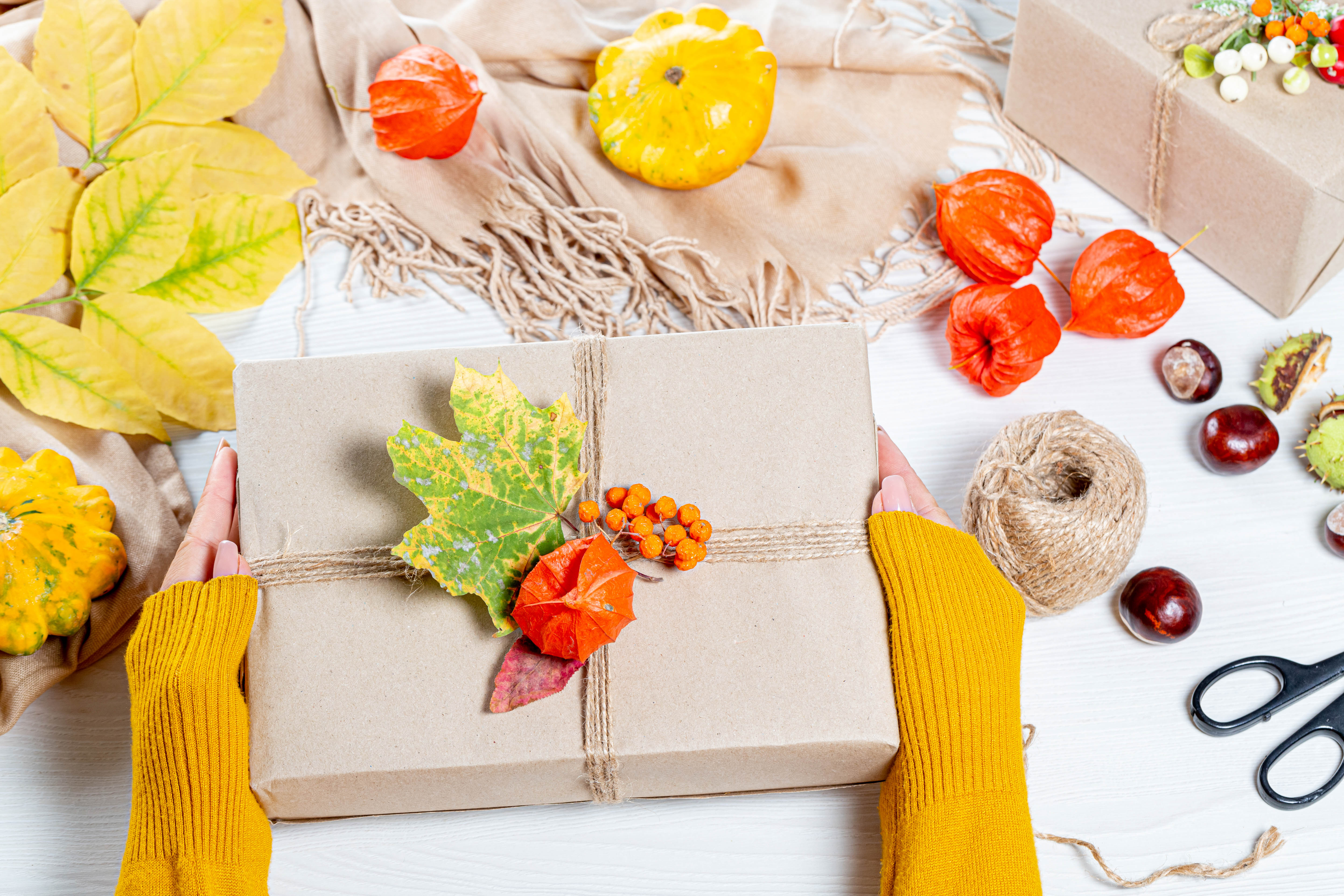 Beautifully packaged gift in autumn style in womens hands. Family holiday concept, Thanksgiving Day