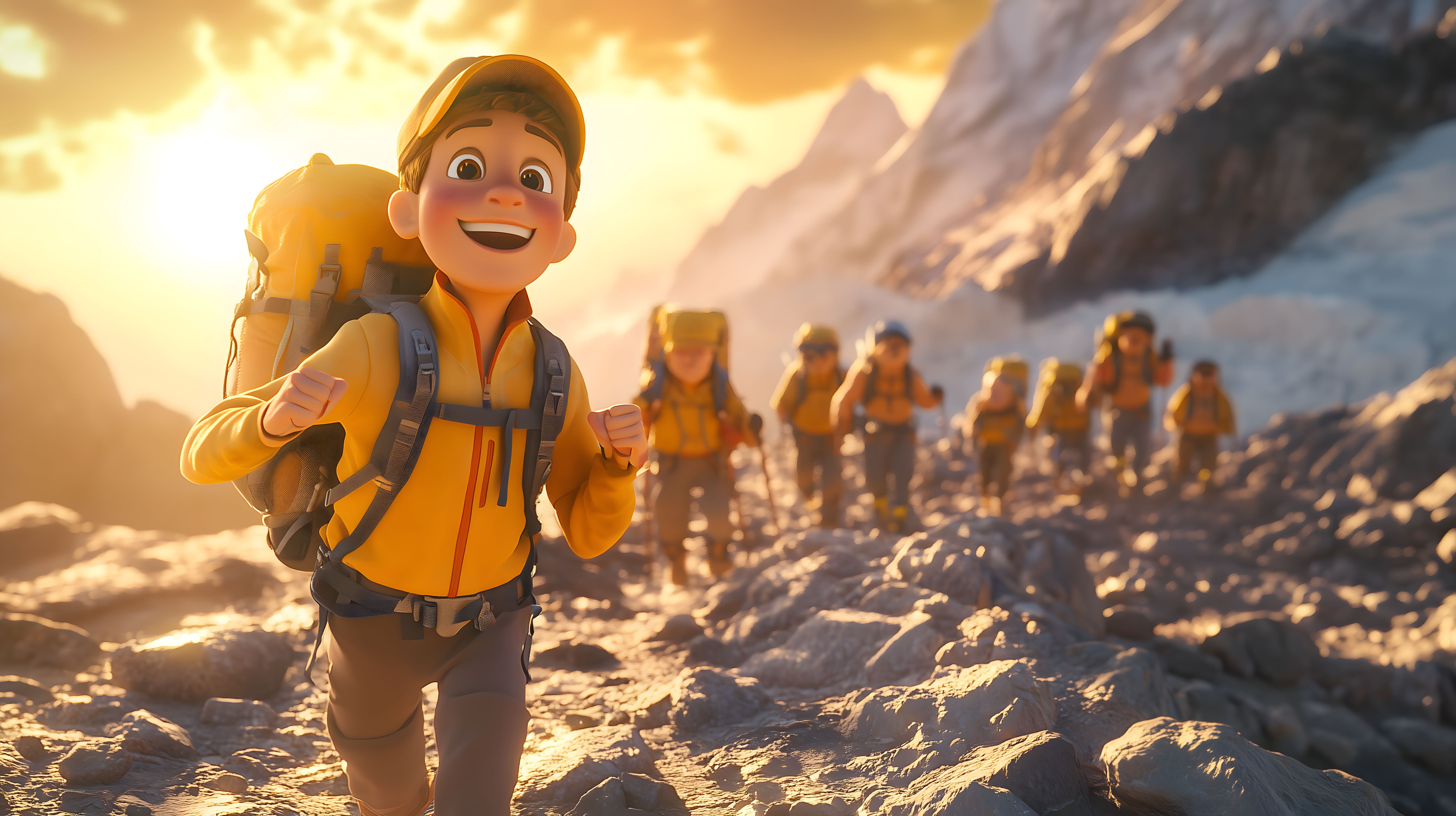 Bergführer leitet Gruppe auf Bergpfad bei Sonnenuntergang