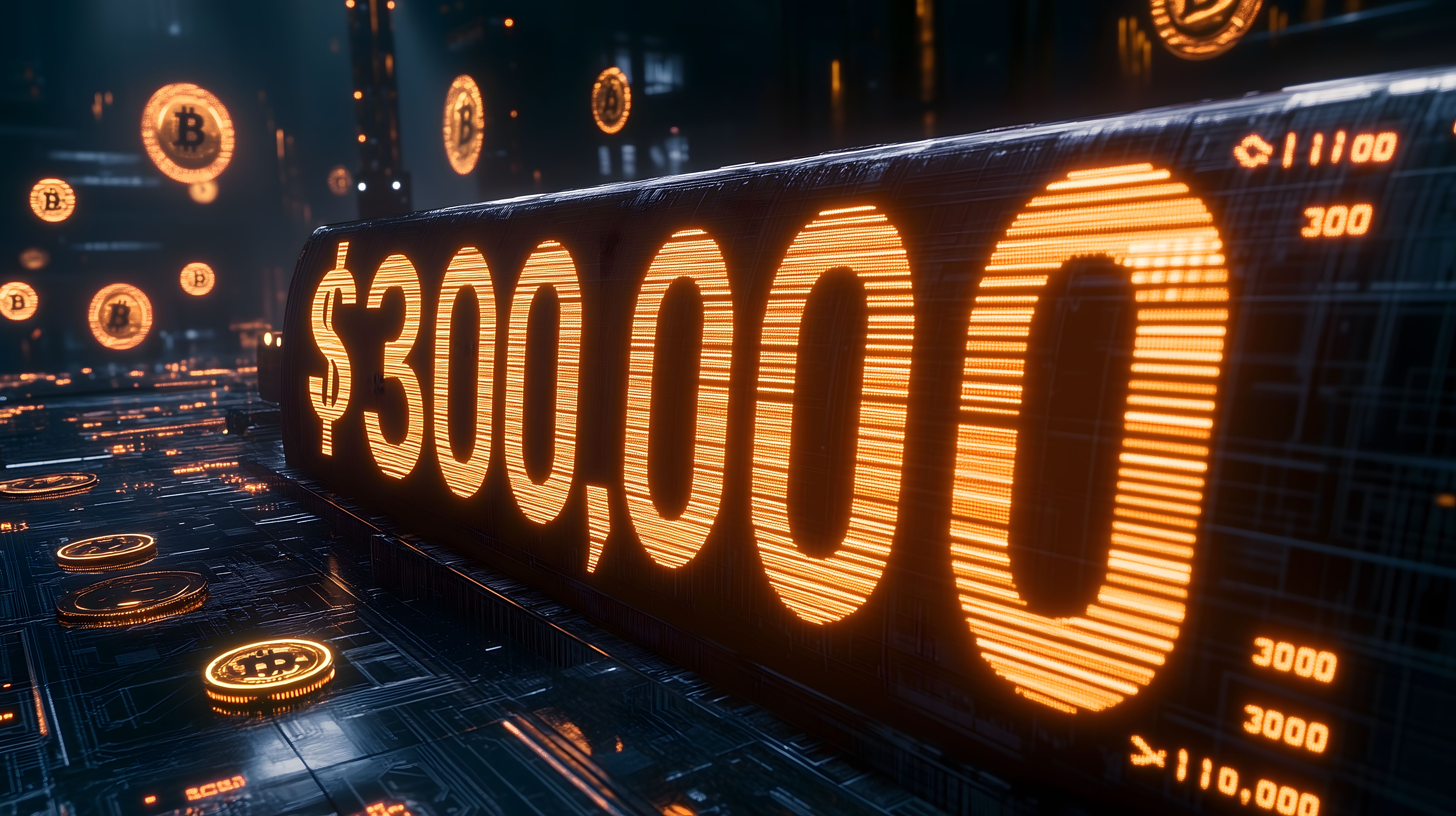 Bitcoin erreicht 300.000 Dollar - Symbol der Kryptowährung mit Wert in leuchtendem Orange