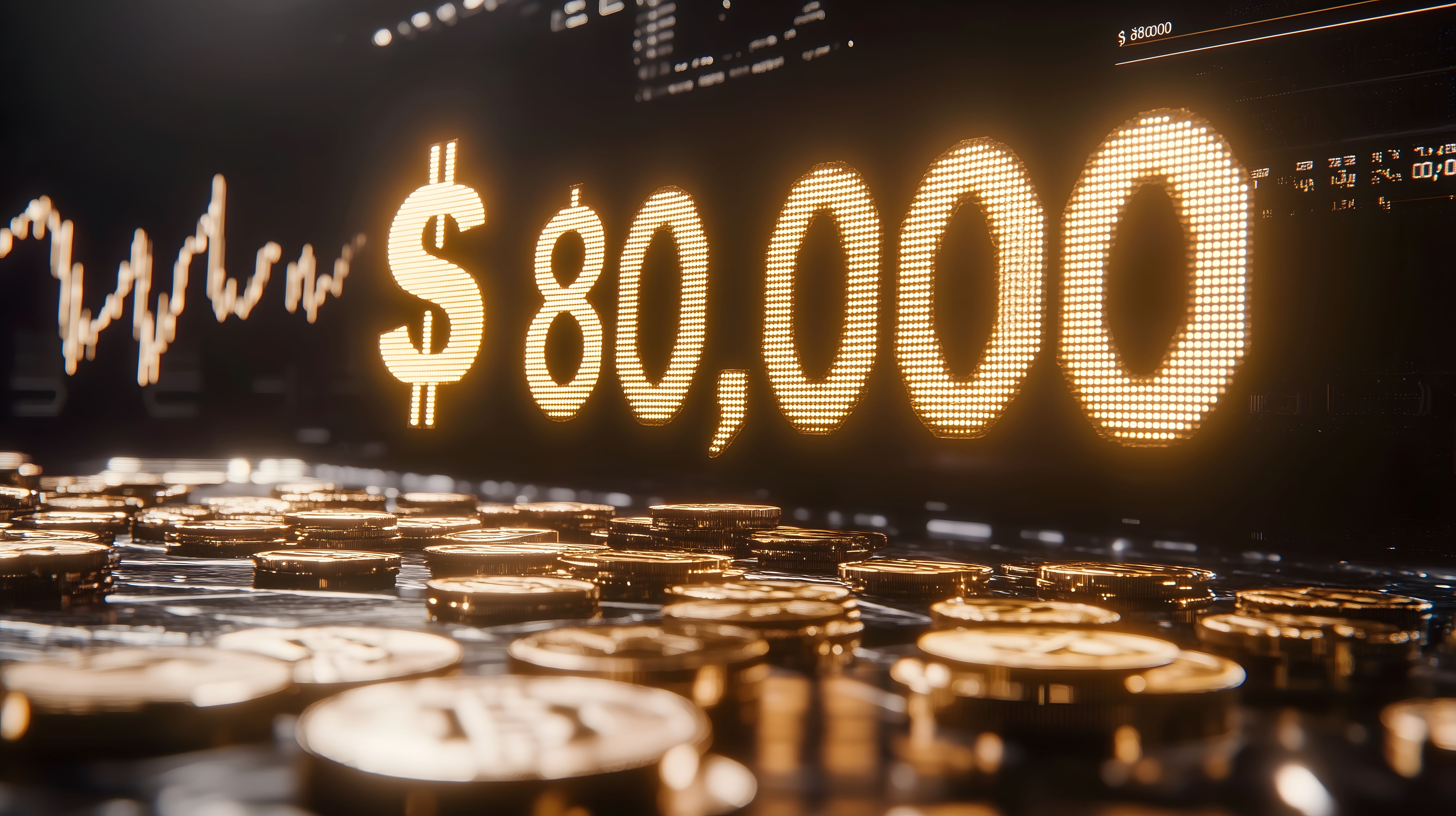 Bitcoin erreicht 80.000 USD – Futuristische Darstellung mit leuchtendem Finanzdisplay