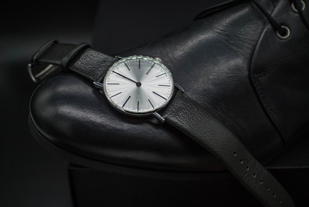 Black leather shoes and wrist watch. Formal dress code
