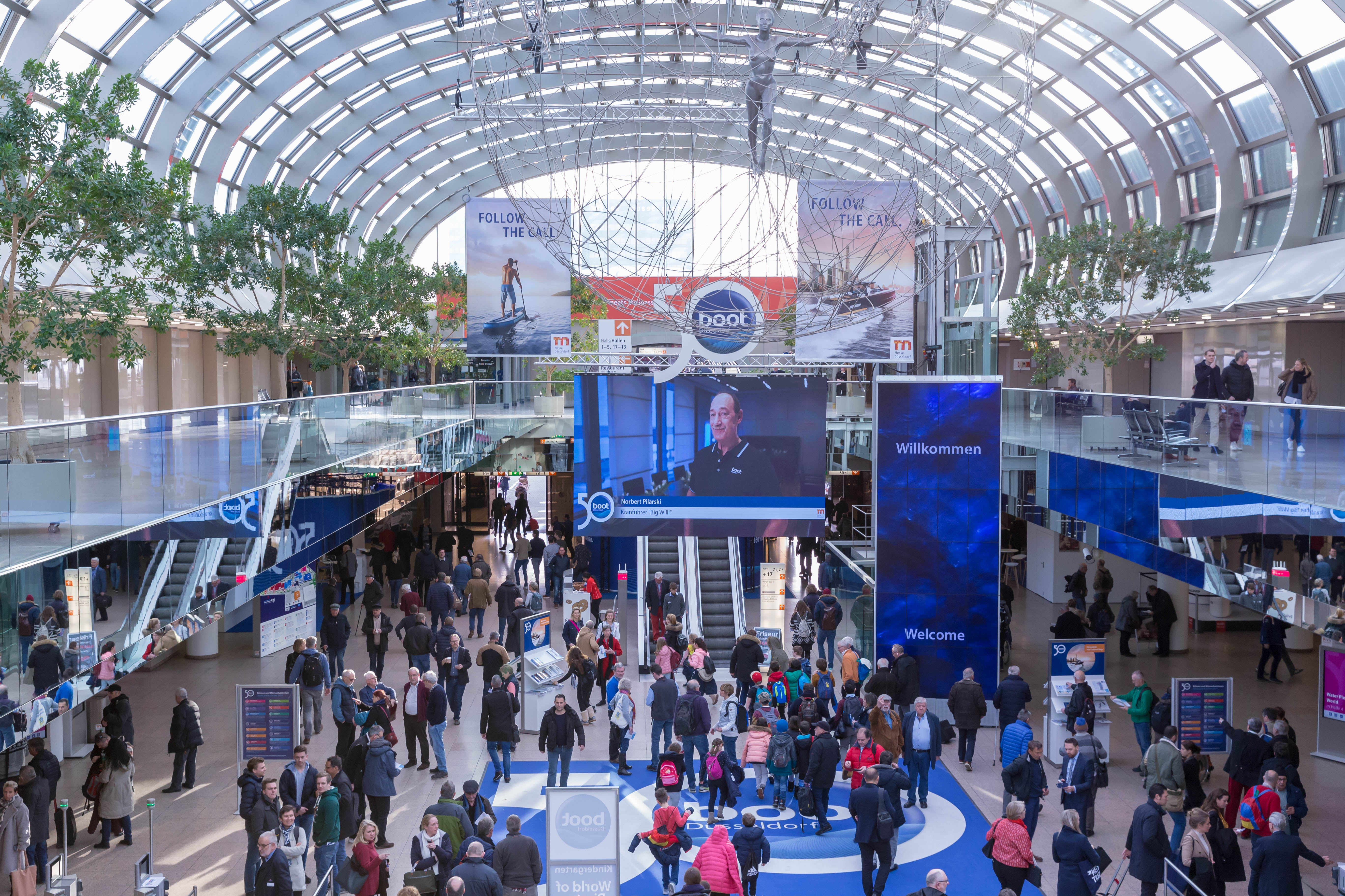 Blick auf Eingangshalle der boot Düsseldorf mit Besuchern und Plakaten zum 50. Messejubiläum