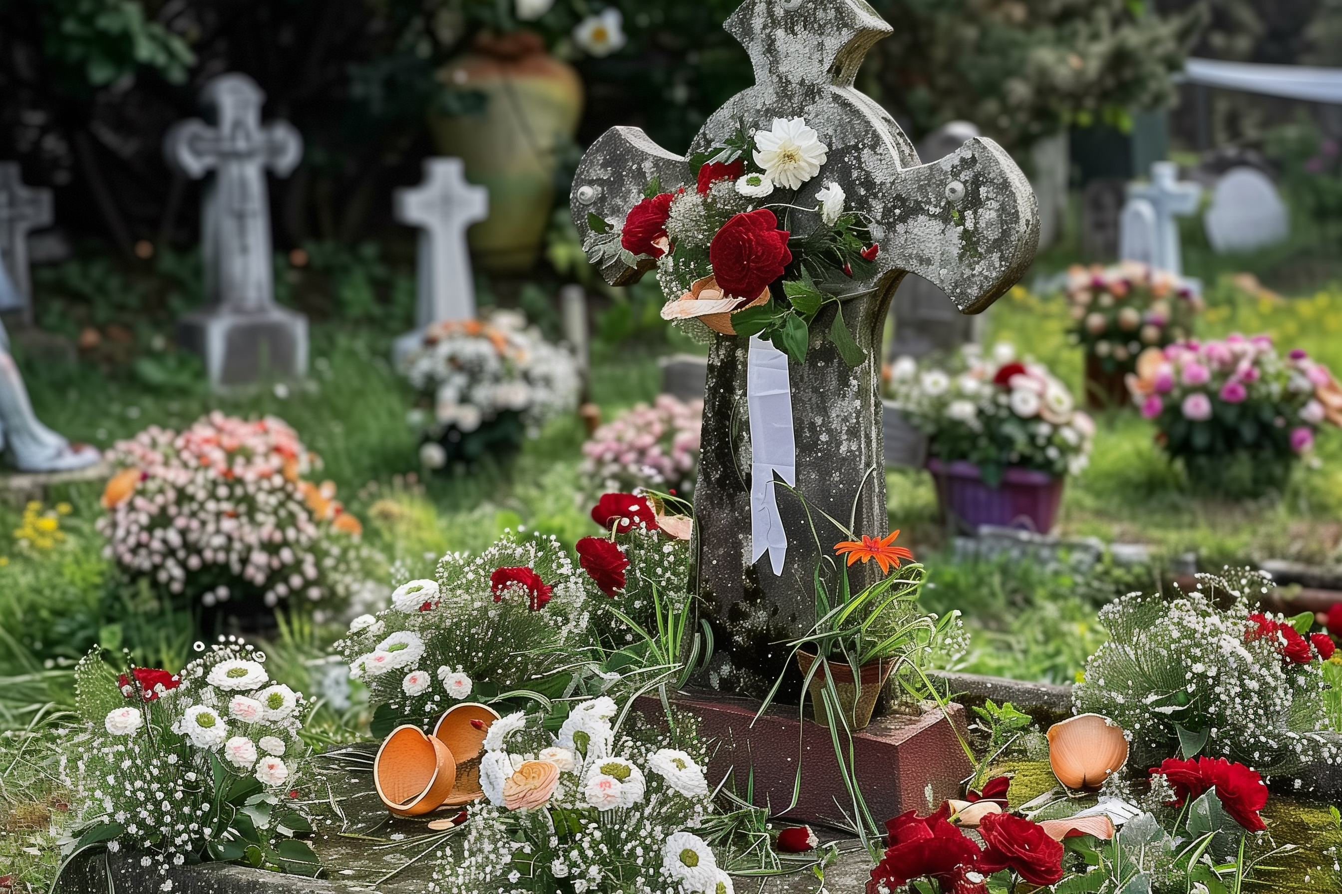 Blumengeschmücktes Grabmal auf einem Friedhof