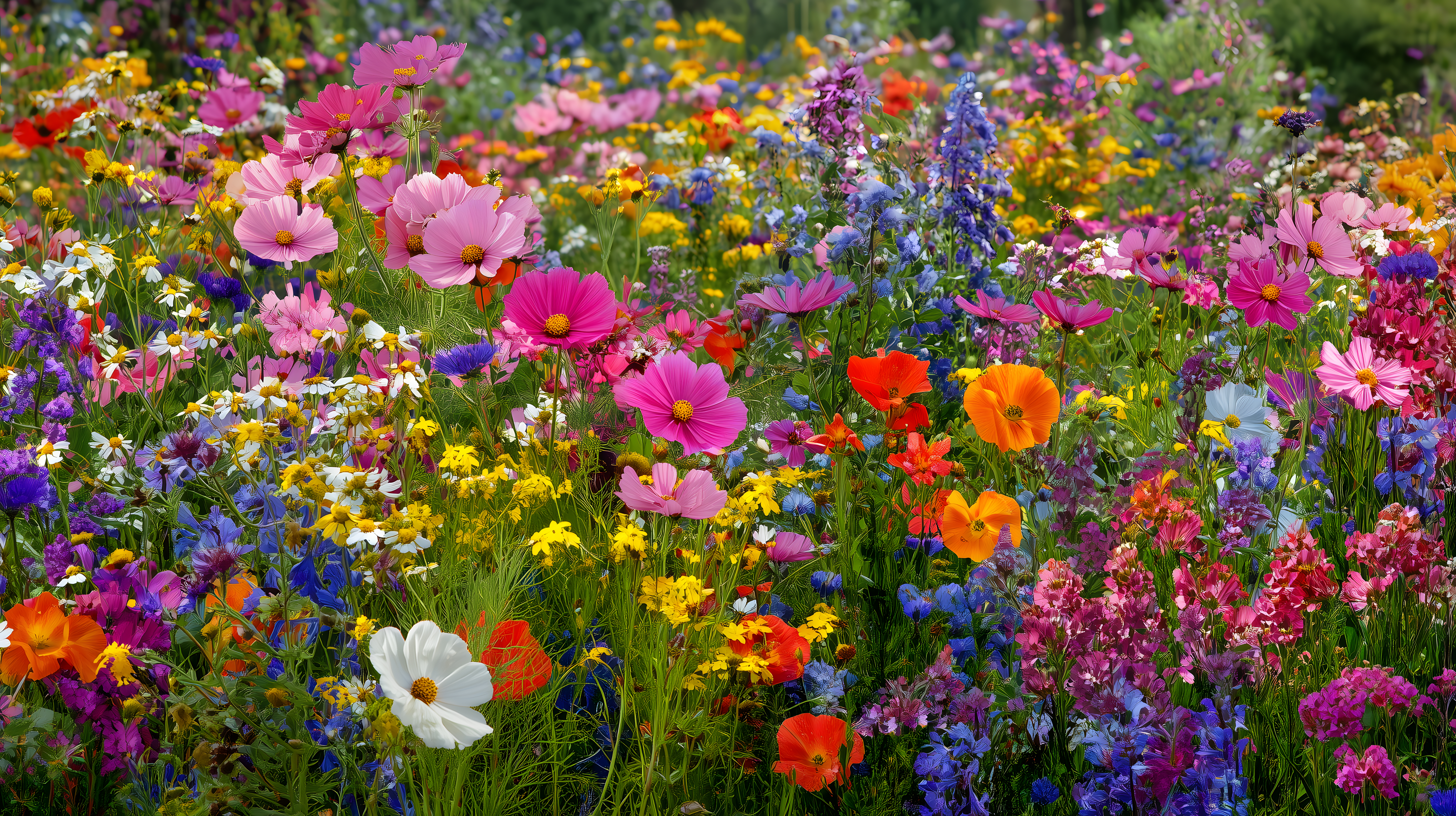 Blumenwiese voller bunter Sommerblumen in natürlicher Landschaft