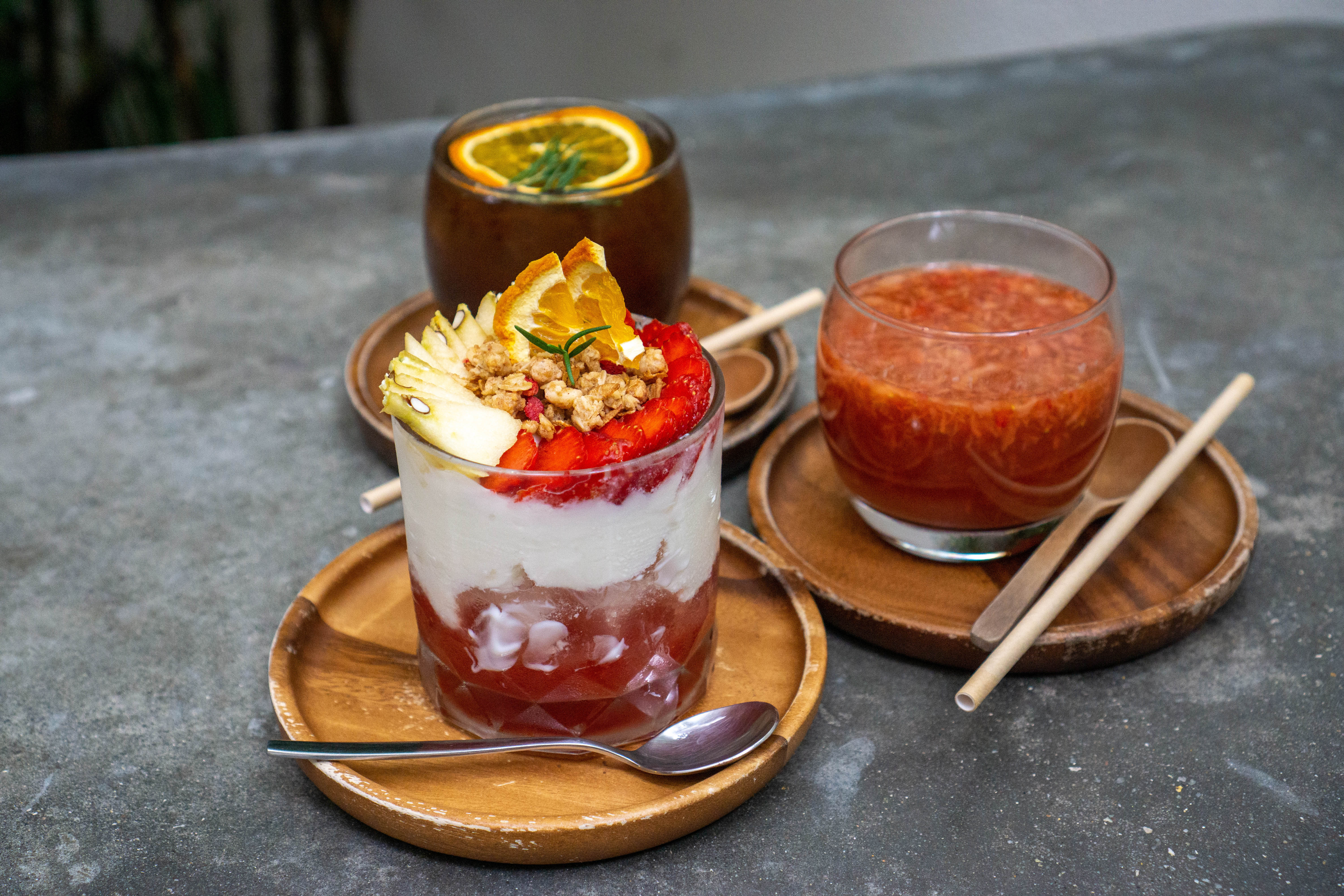 Bokeh Photo of Strawberry Yogurt with fresh Fruits with Hot Strawberry Tea and Burnt Orange Cold Brew Coffee in the Background