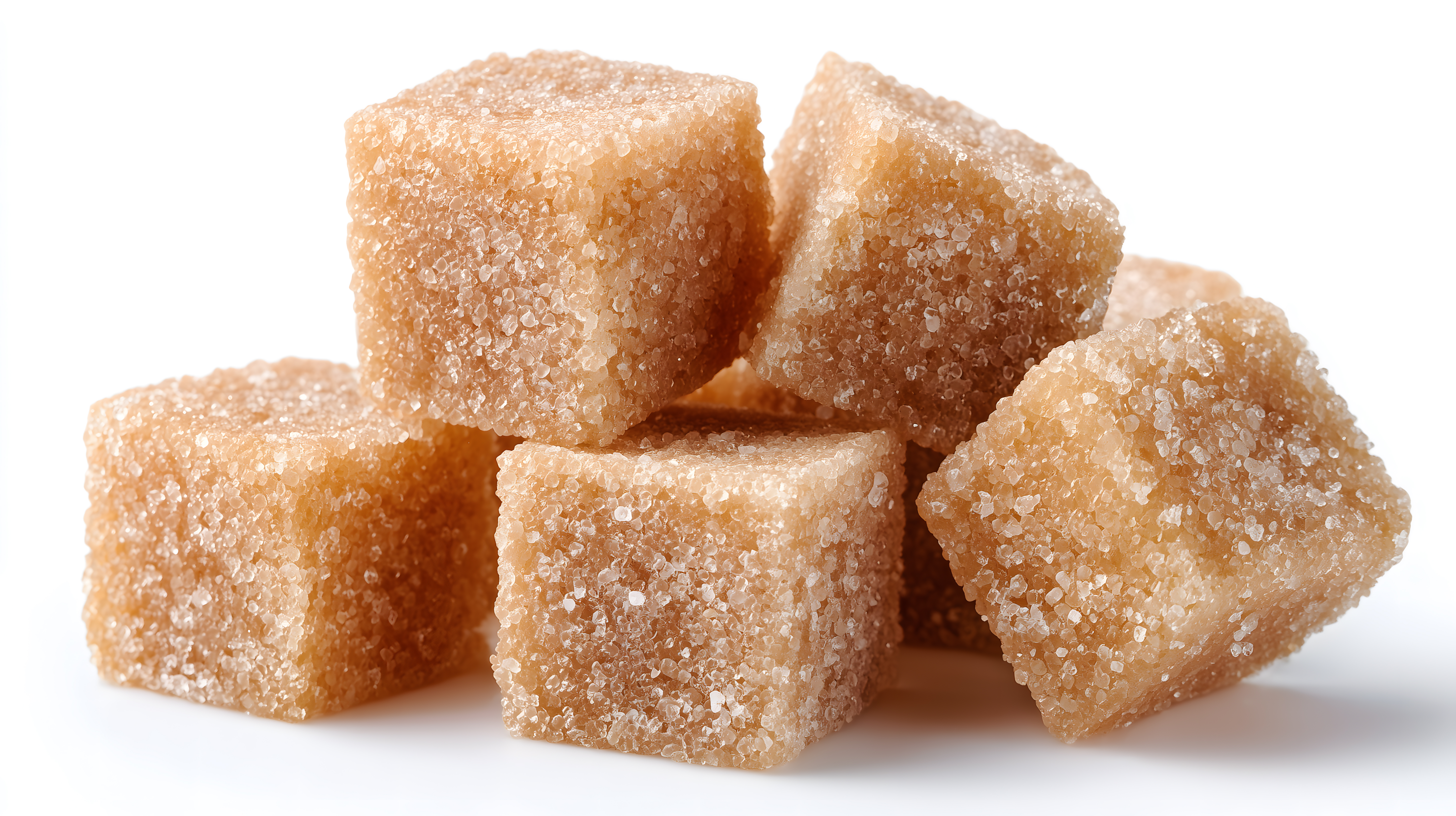 Brauner Würfelzucker in Nahaufnahme auf weißem Hintergrund