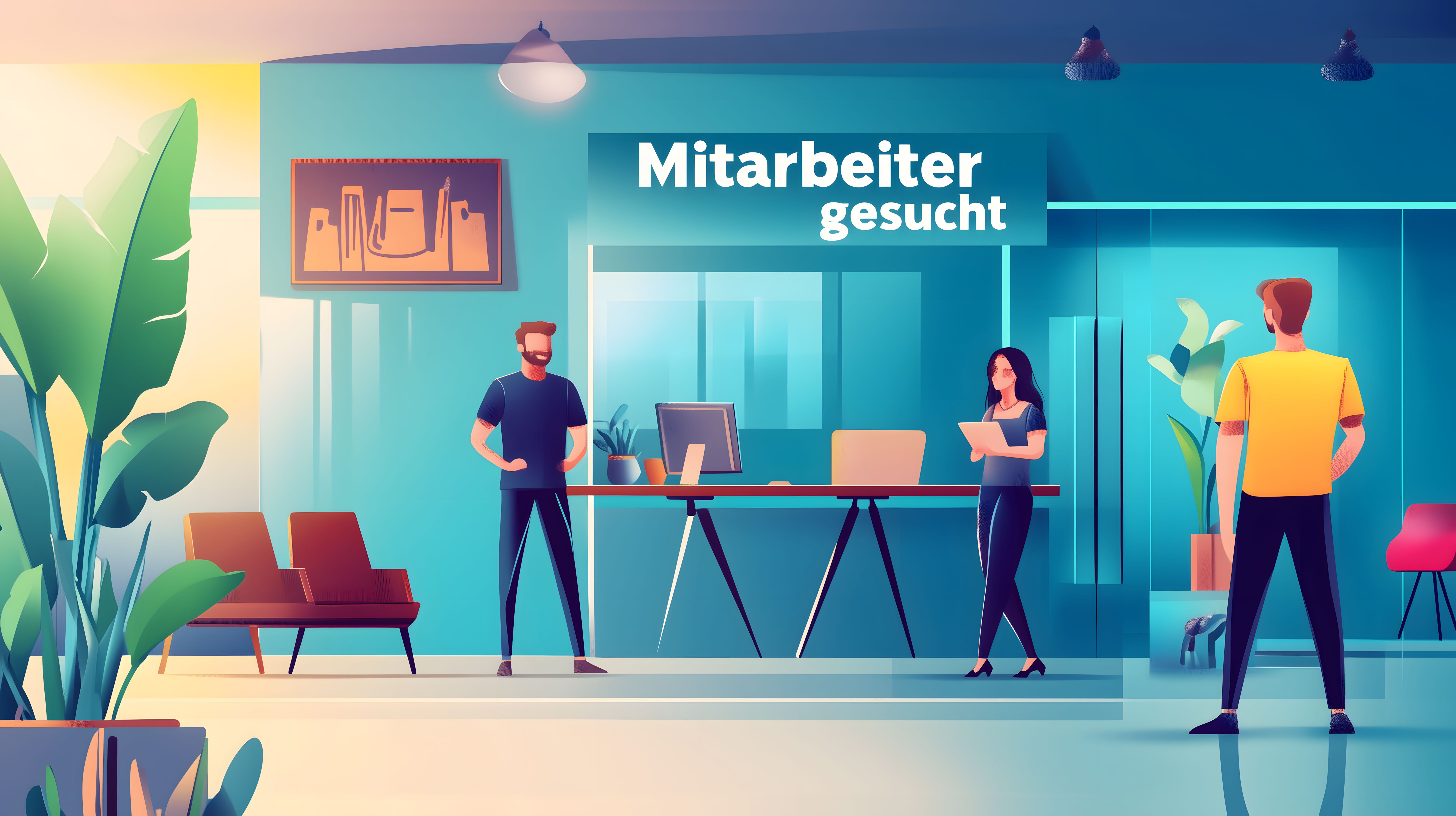 Bürofläche mit "Mitarbeiter gesucht"-Schriftzug und angedeutetem Bewerbungsgespräch