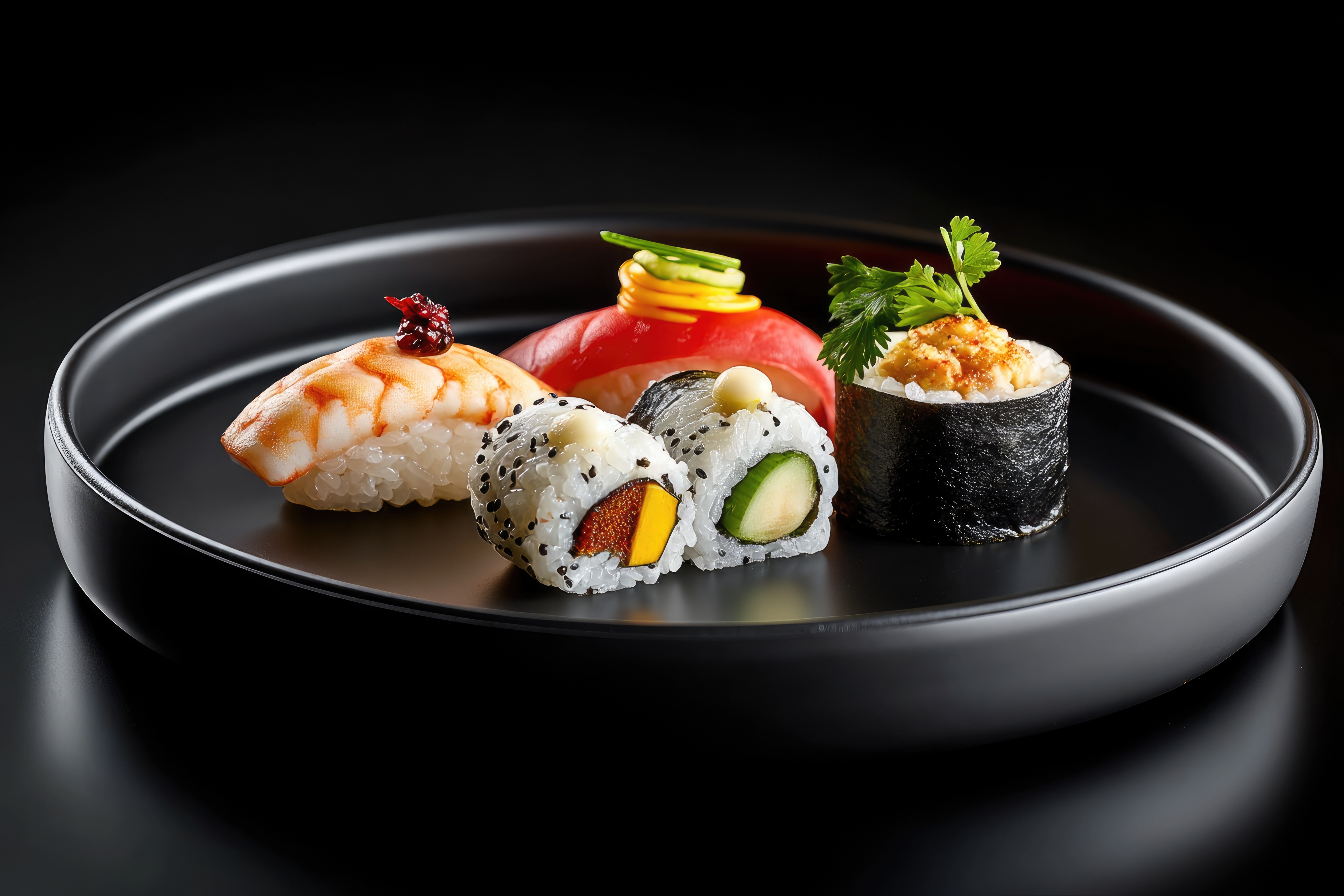 Bunte Auswahl an Sushi auf schwarzem Teller