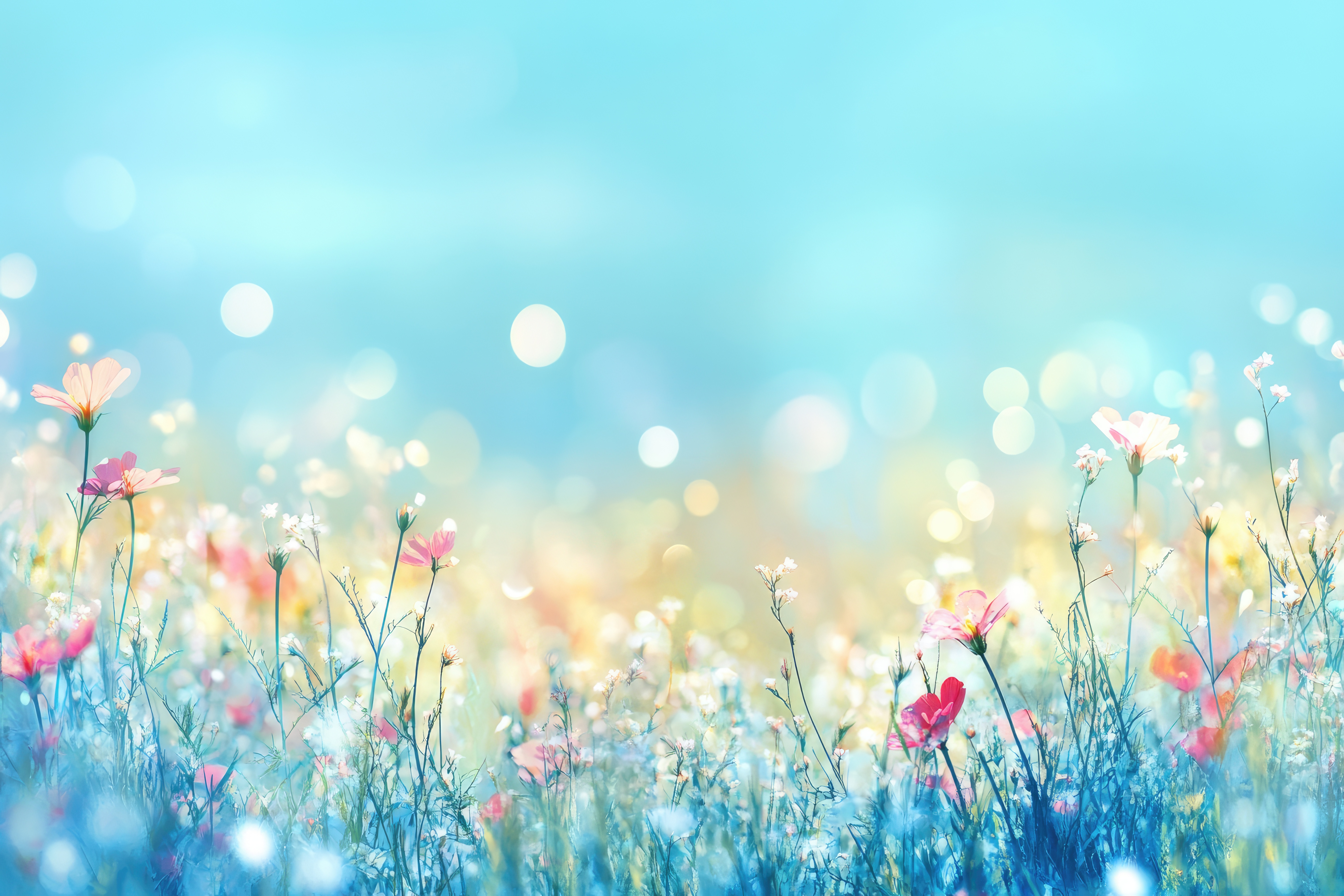 Bunte Blumenwiese mit Sonnenstrahlen und blauem Himmel
