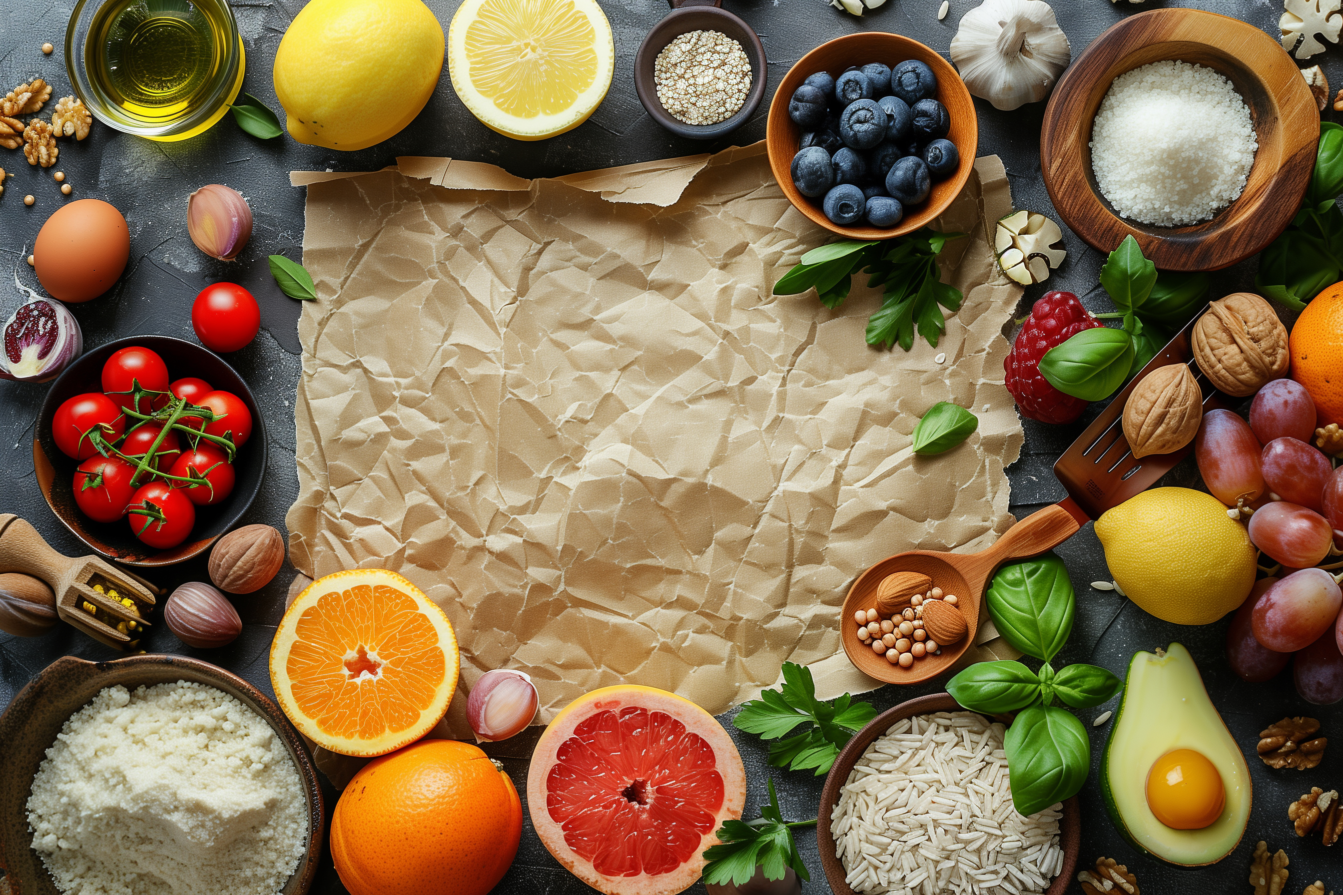Bunte Vielfalt frischer Zutaten auf rustikalem Hintergrund