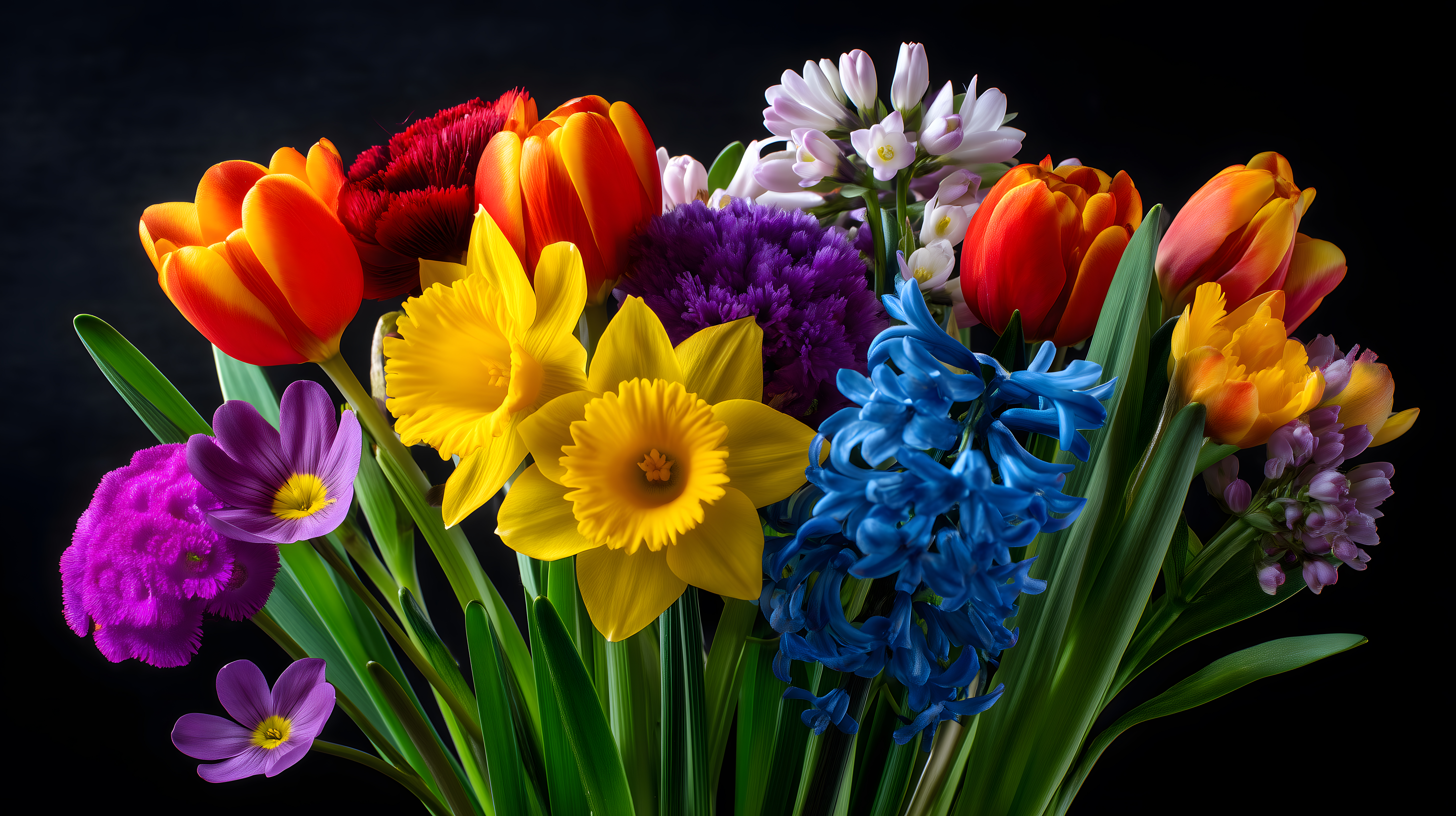 Bunter Frühlingsblumenstrauß vor schwarzem Hintergrund