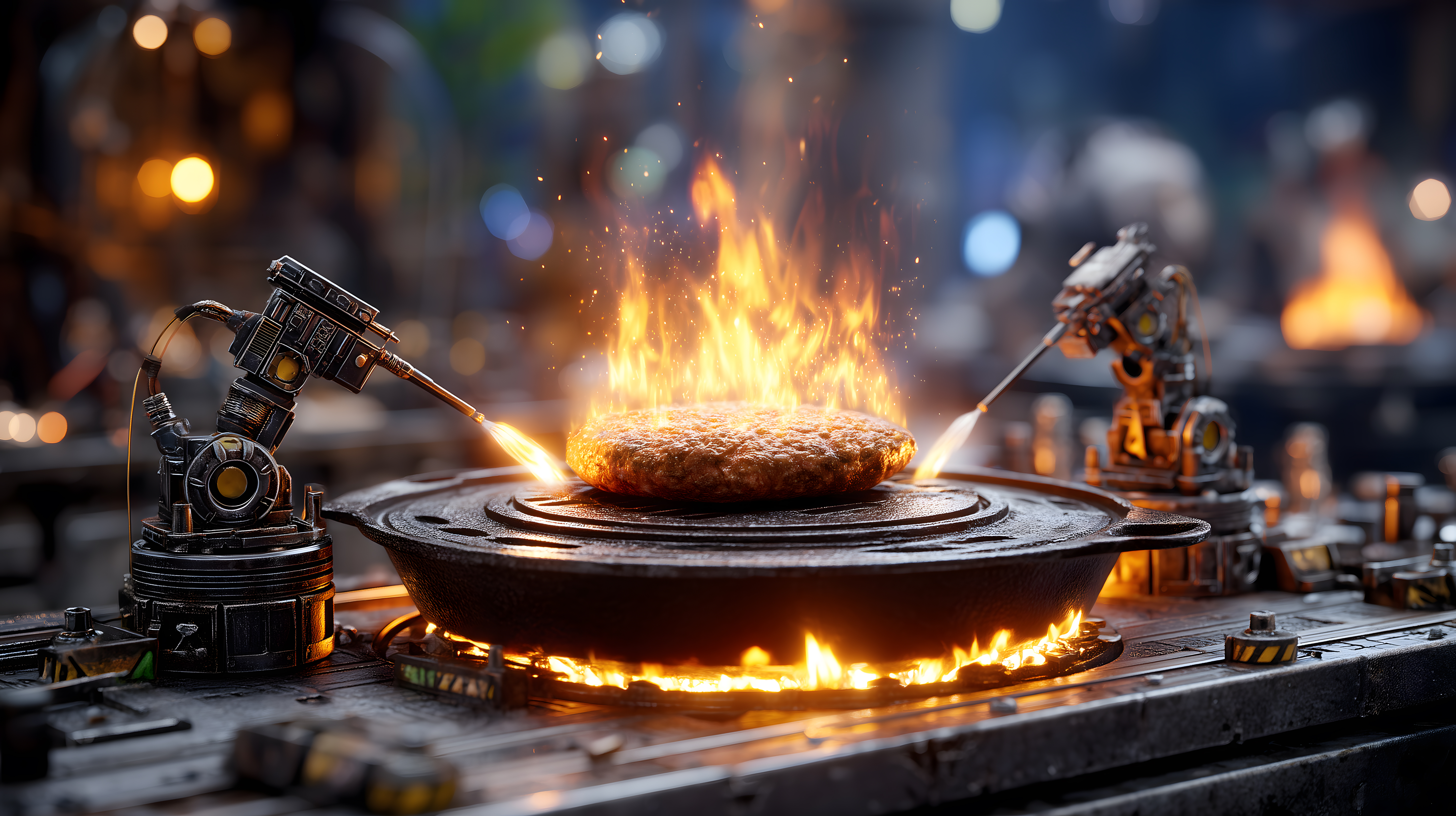 Burger wird mit Feuer von Robotern gegrillt in futuristischer Küche