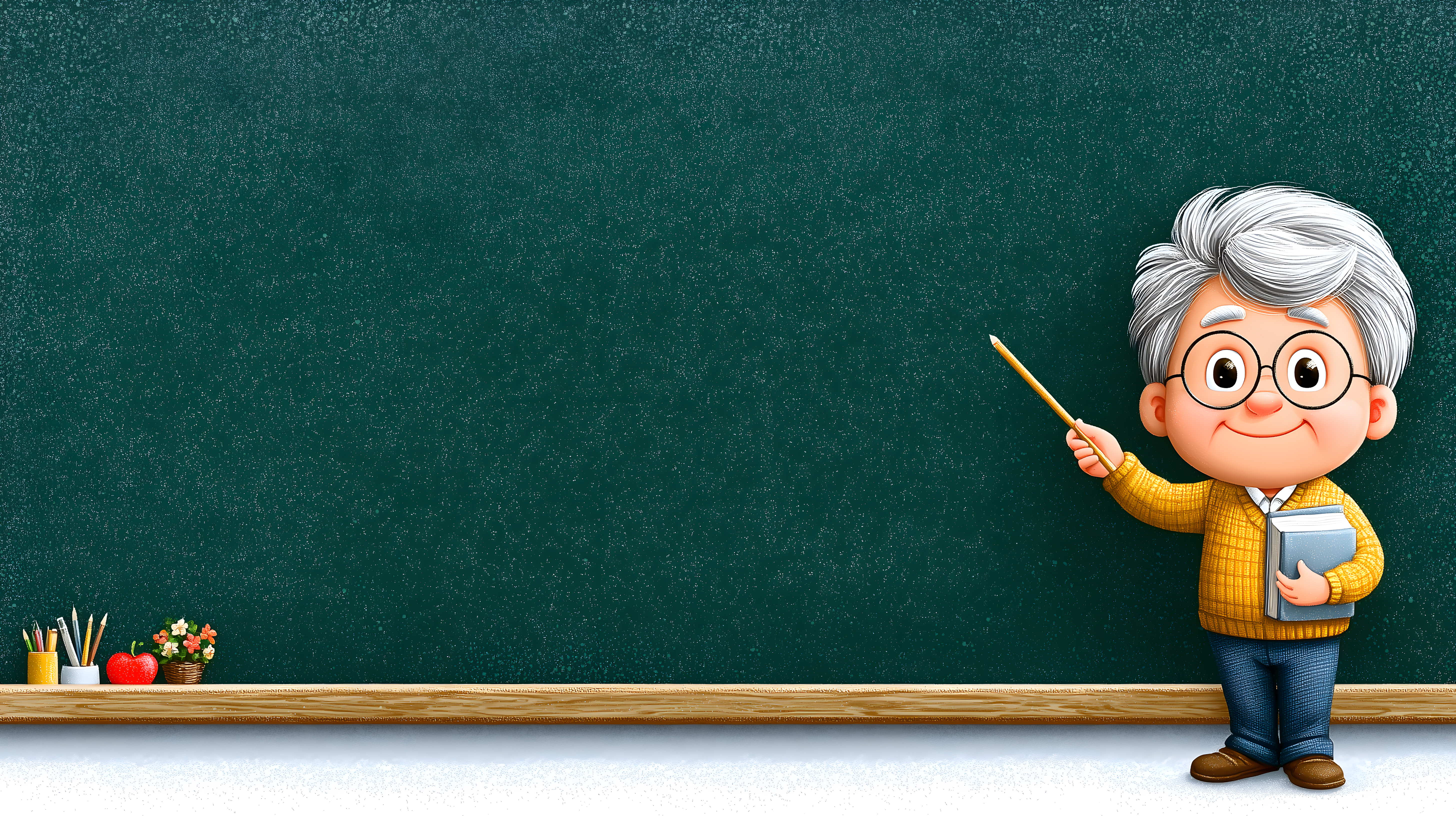 Cartoon Lehrer mit Zeigestock vor grüner Schultafel