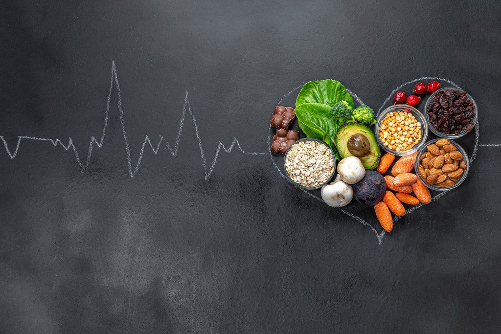 Chalked heart and pulse on a black background with useful products. Top view (Flip 2019)