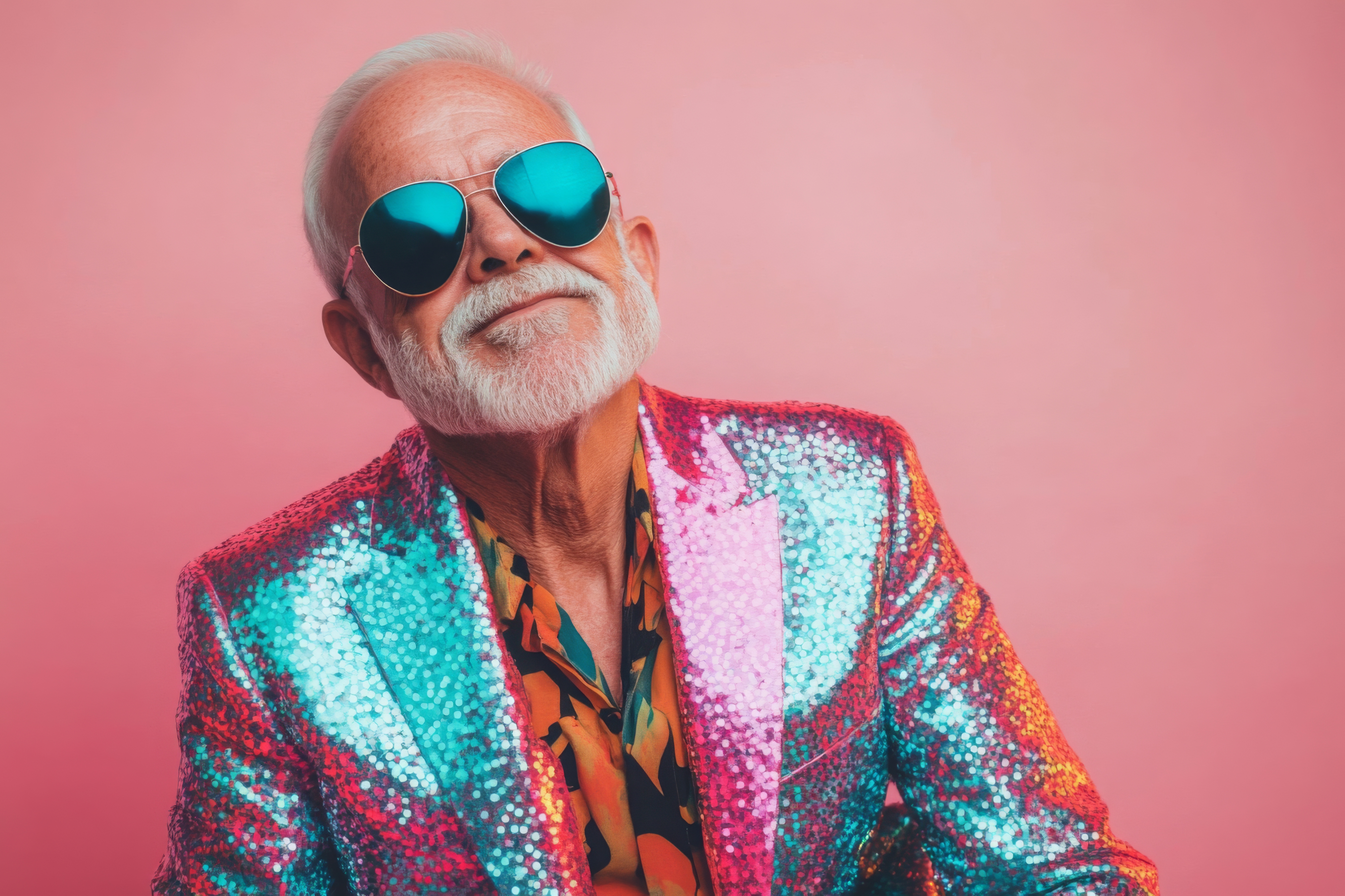 Charismatischer älterer Mann im bunten Disco-Anzug