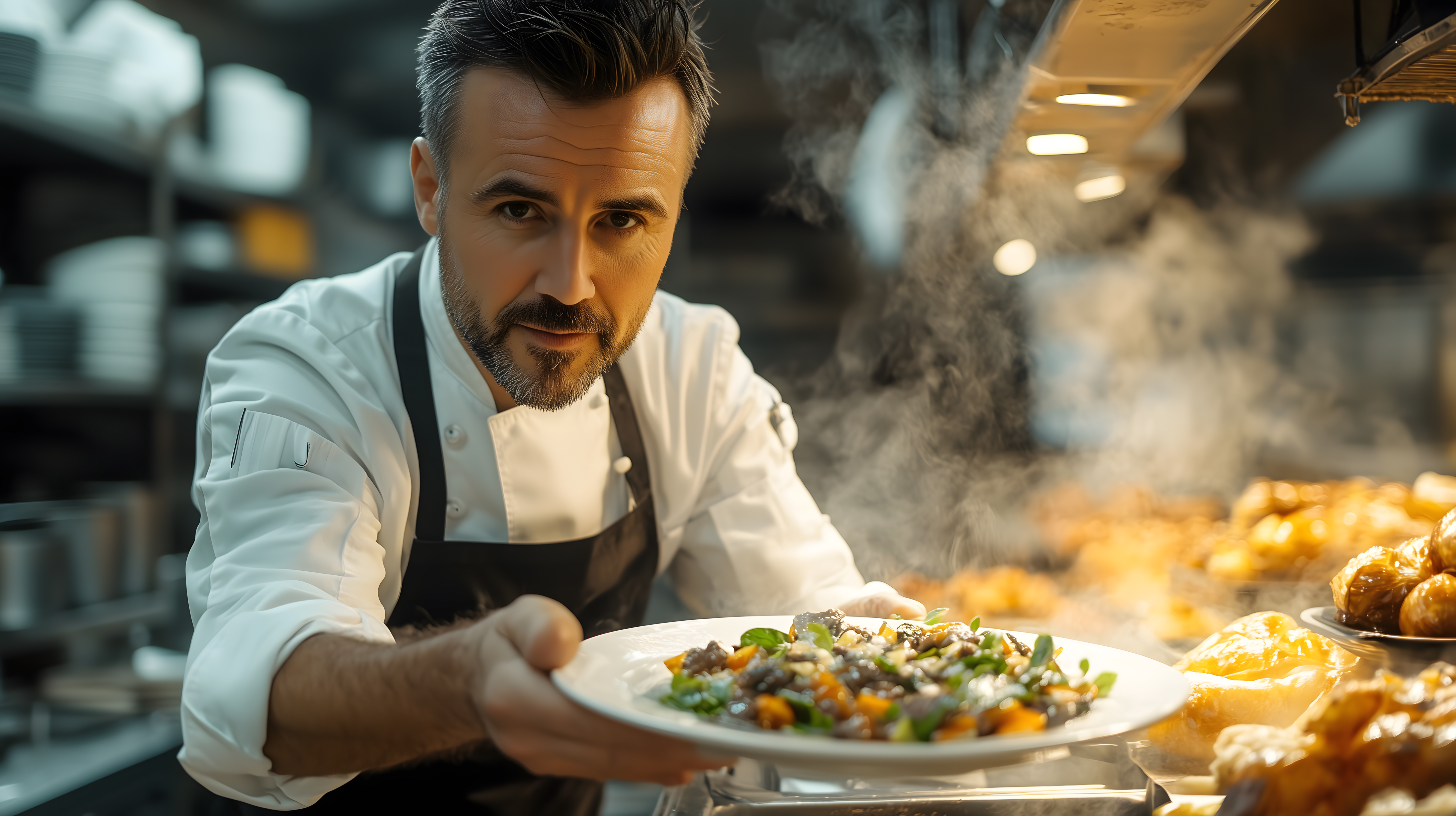 Chefkoch serviert dampfendes Gourmetgericht in Restaurantküche
