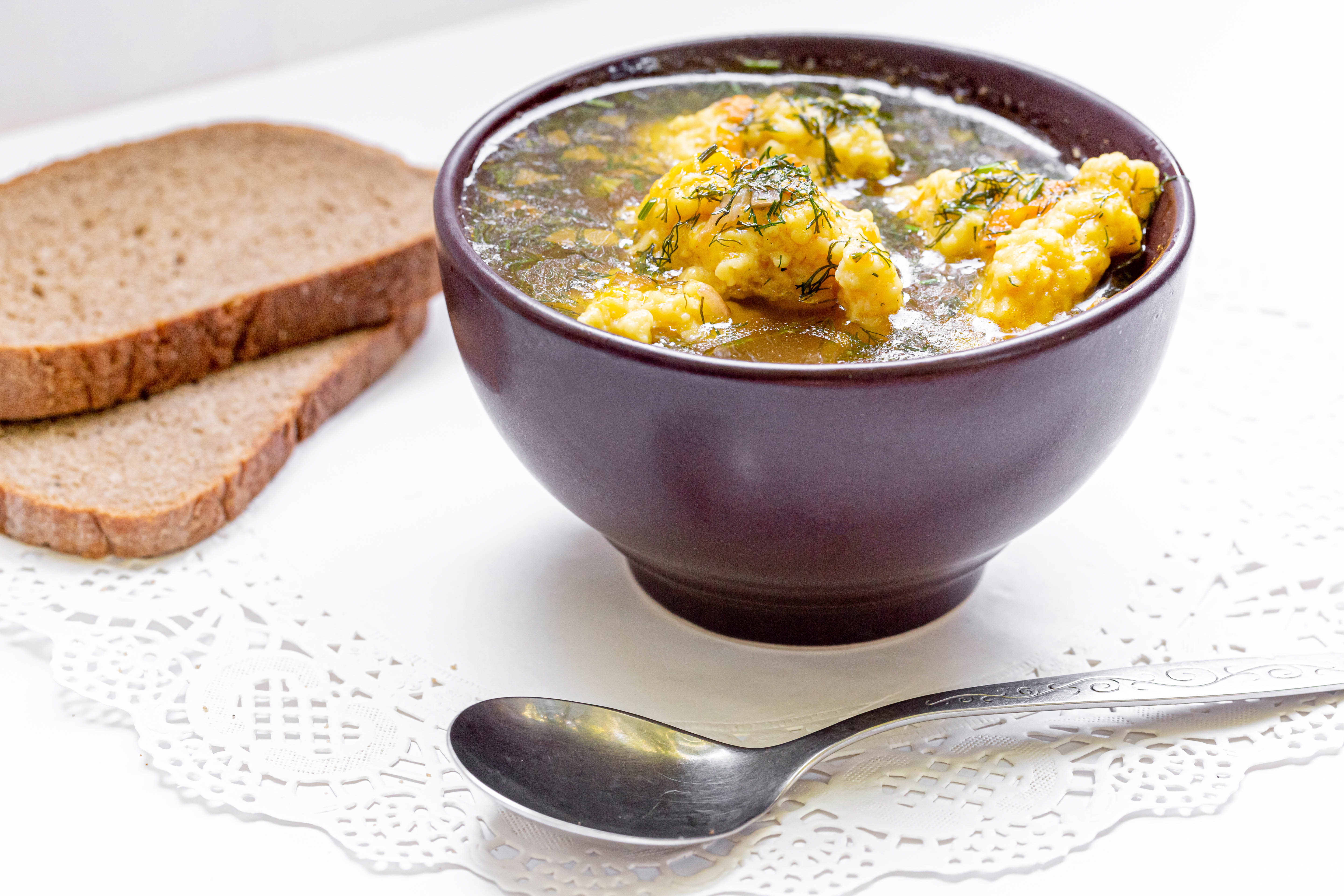 Chicken soup with dumplings, pieces of black bread with a spoon