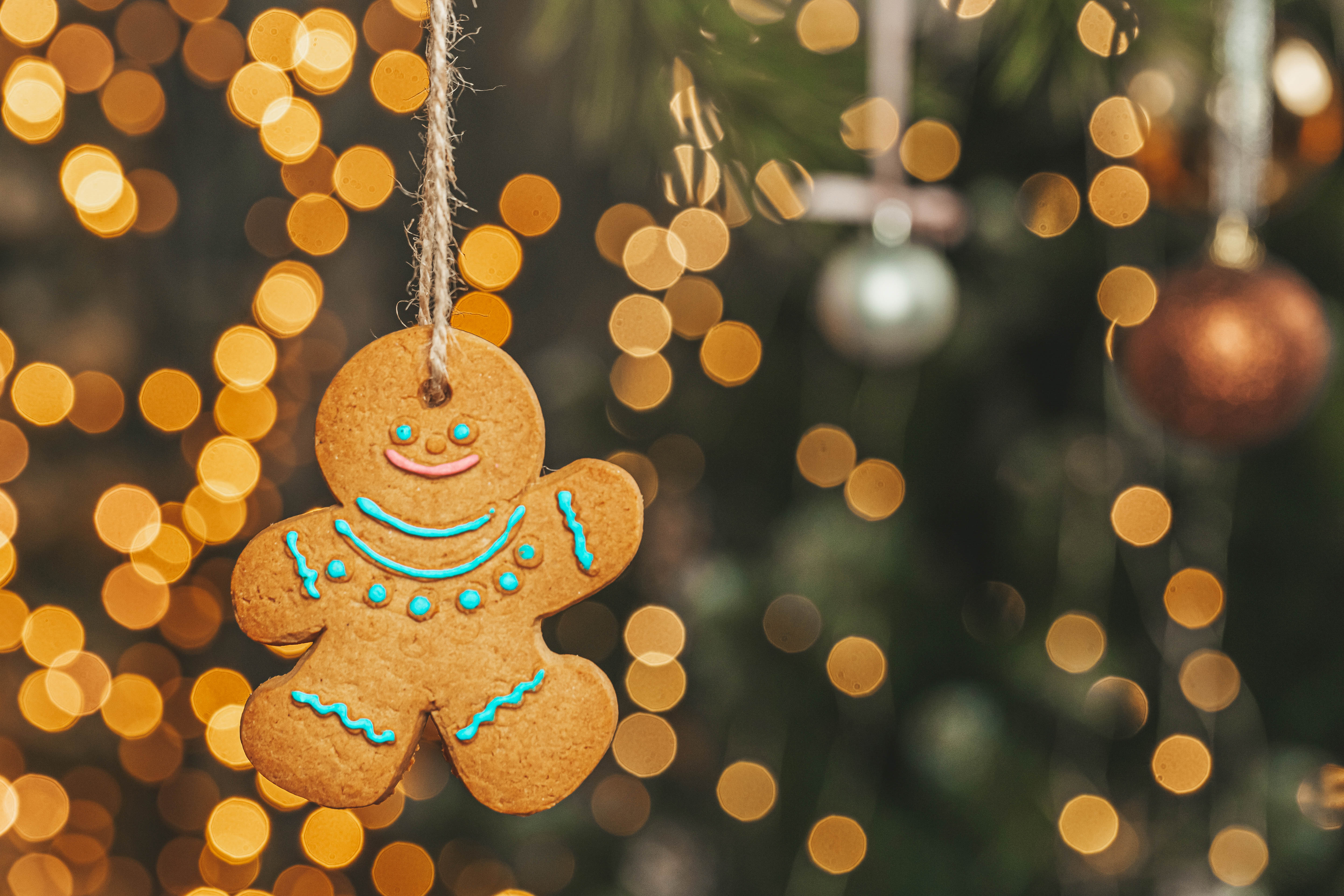 Christmas gingerbread man on blurred background of glowing garlands