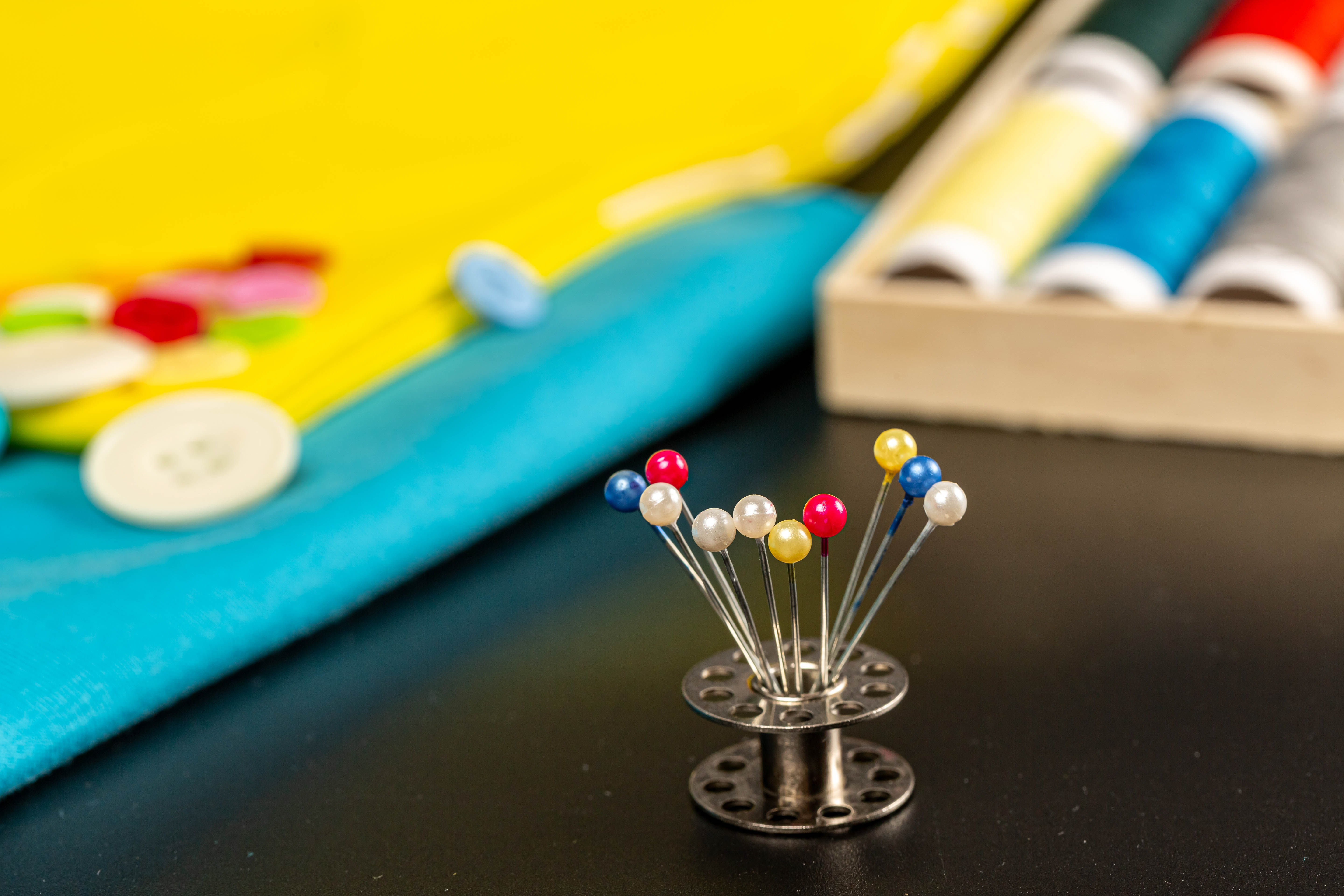 Close-up, needles in a metal coil on a dark background