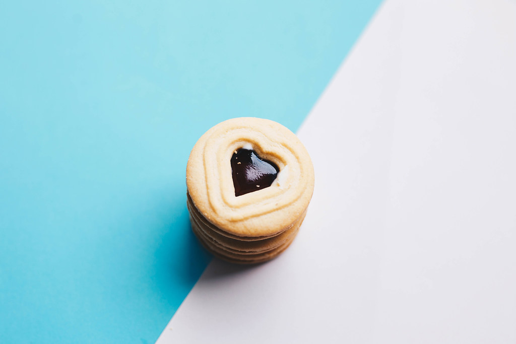 Close up of heart shaped cookies on colorful background.