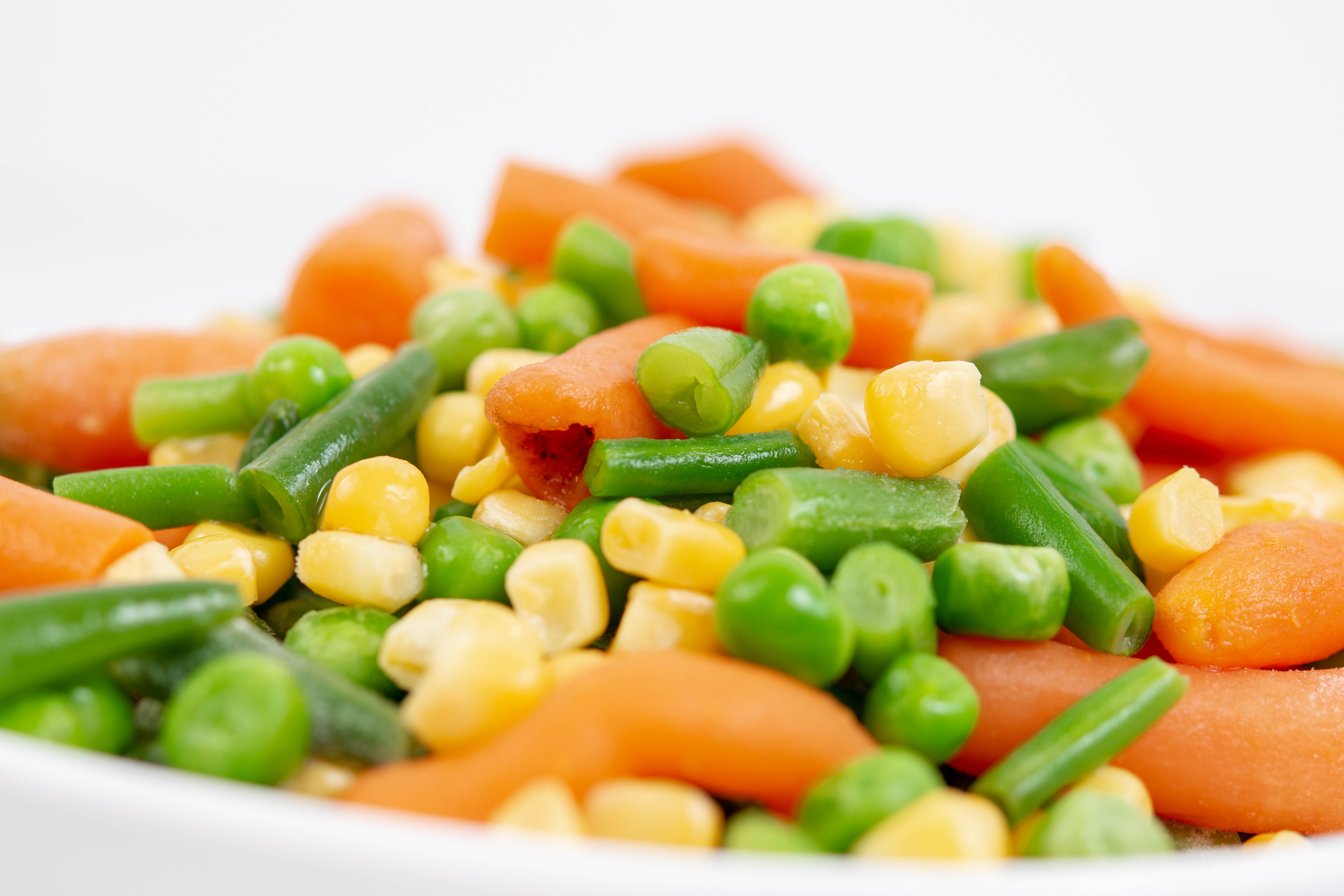 Closeup macro of Fresh raw Carrot Peas Corn and Green Beans