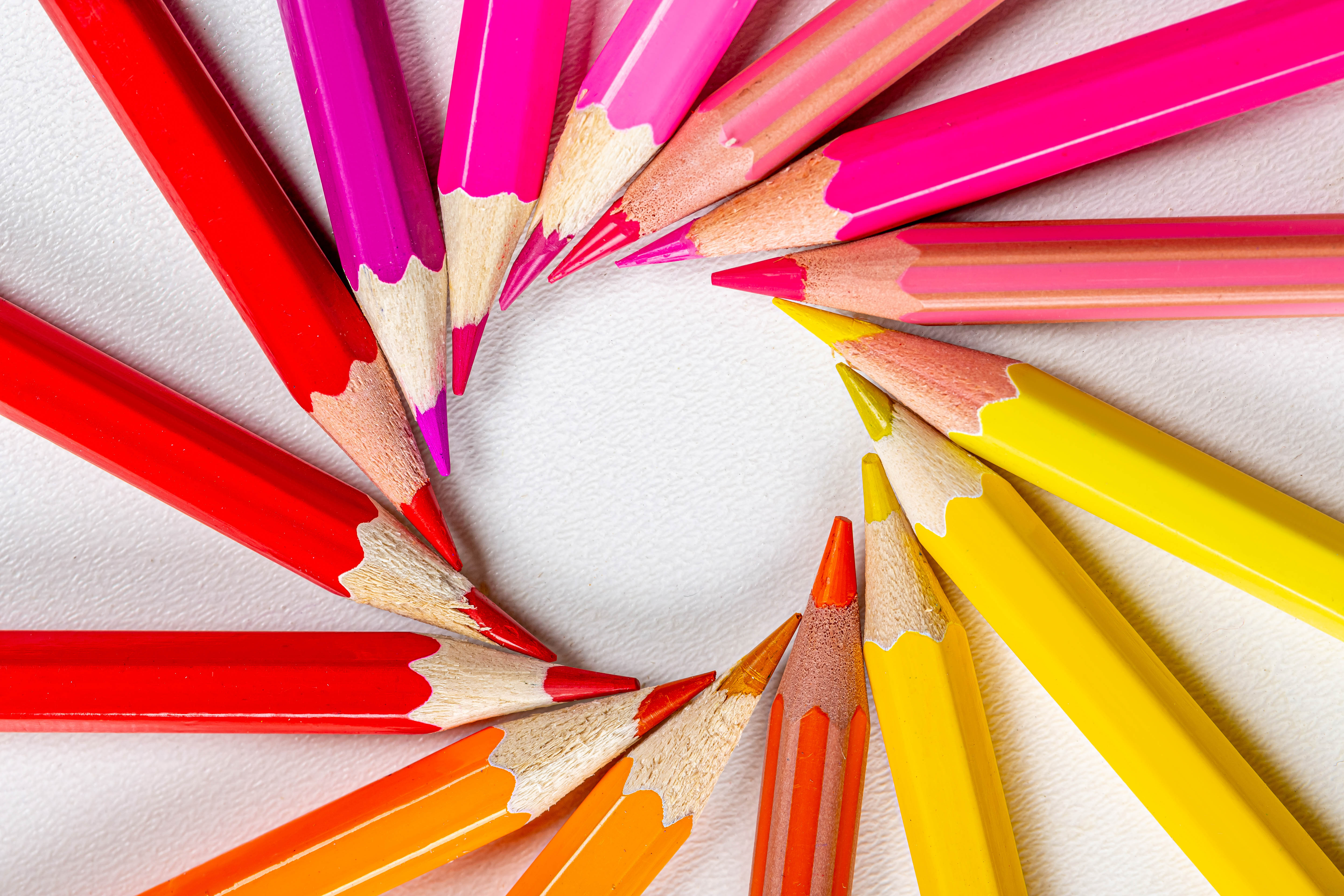 Colored pencils laid out in a circle on a white background