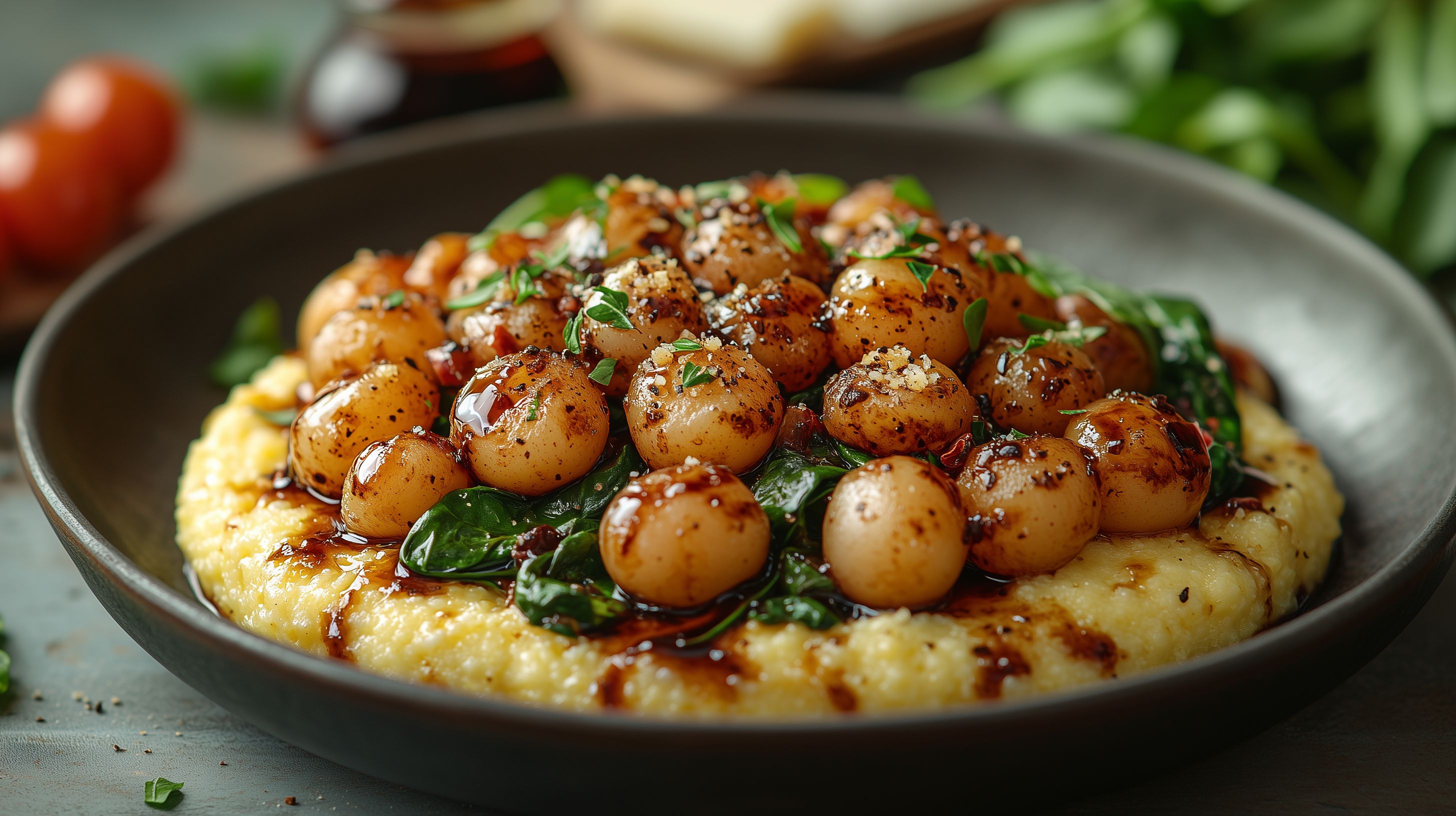 Cremige Polenta mit Balsamico-Perlenzwiebeln und frischen Kräutern