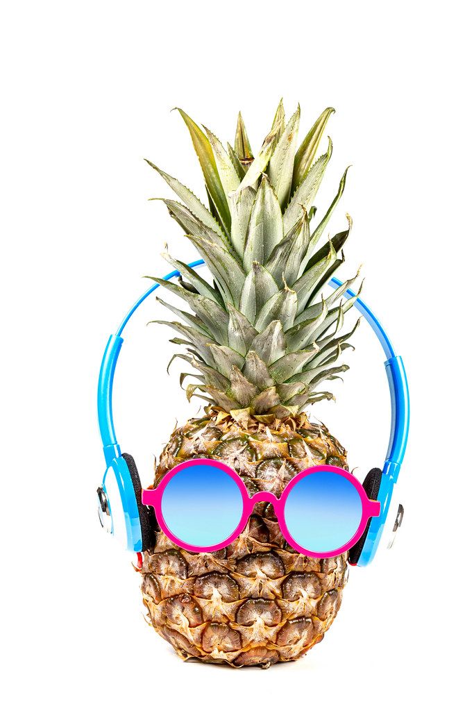 Das Konzept von Sommerurlaub und Erholung: eine Ananas trägt Sonnenbrille und Kopfhörer vor weißem Hintergrund
