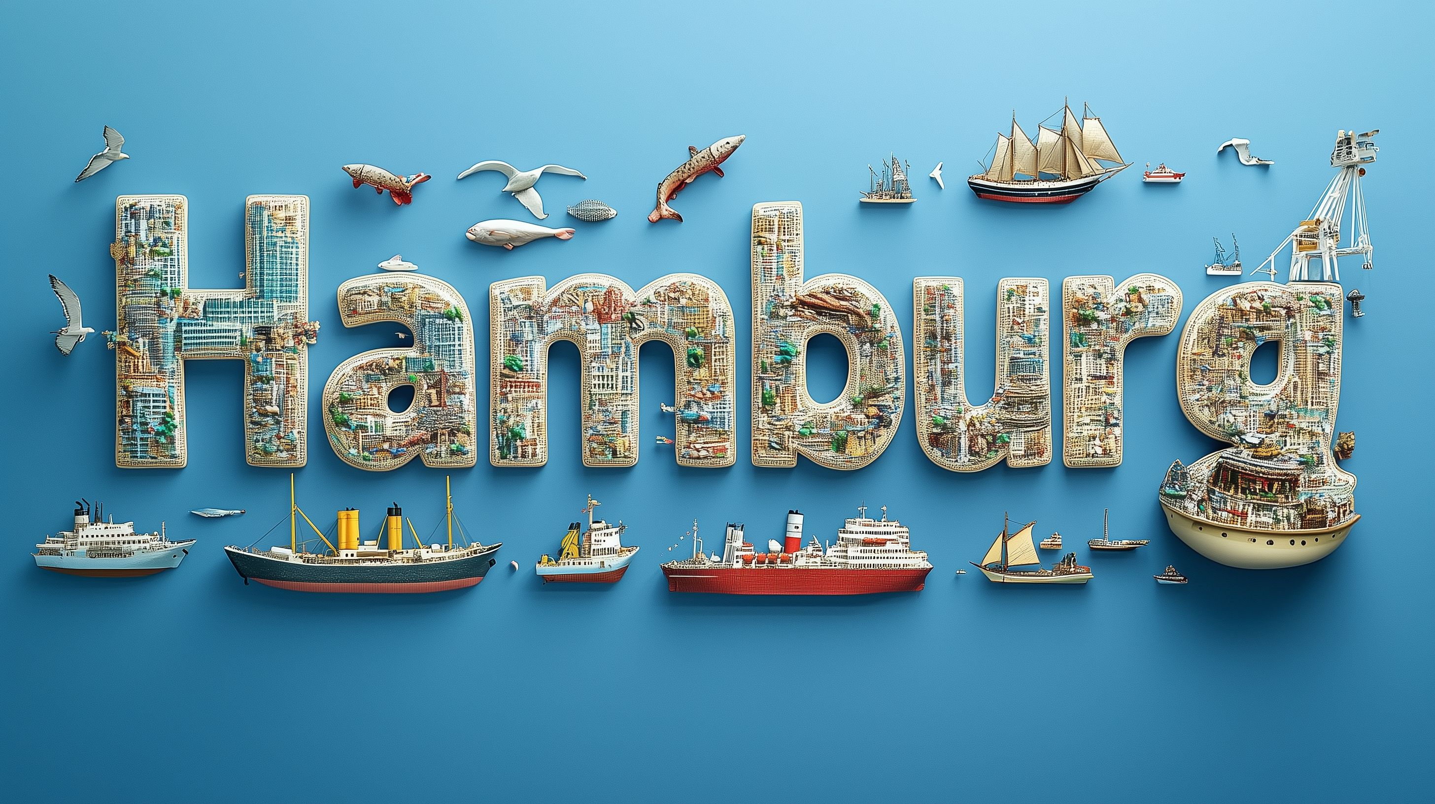 Das Wort Hamburg mit Schiffs- und Hafensymbolen