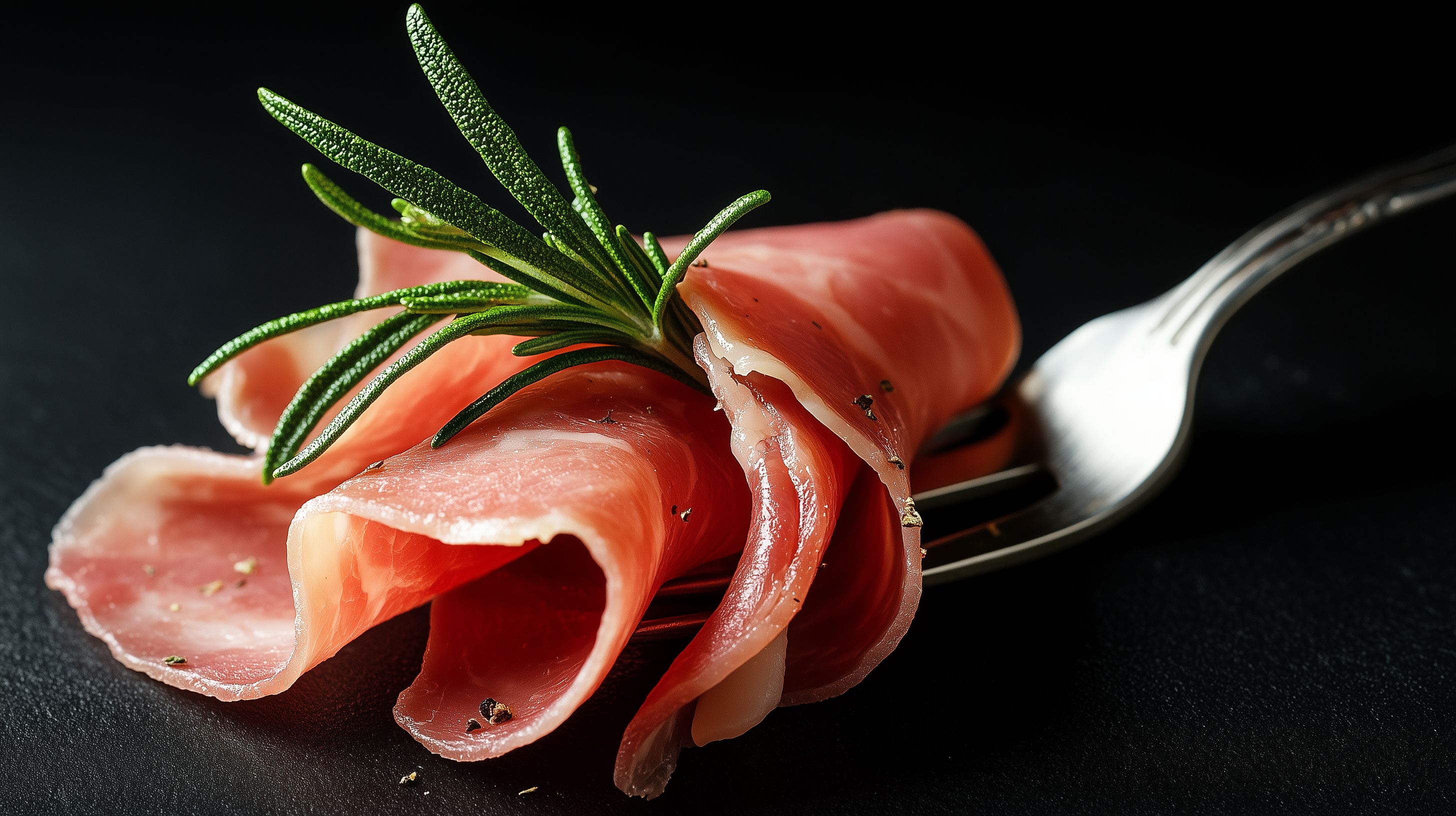 Delikat gefalteter Schinken mit Rosmarin auf einer Gabel