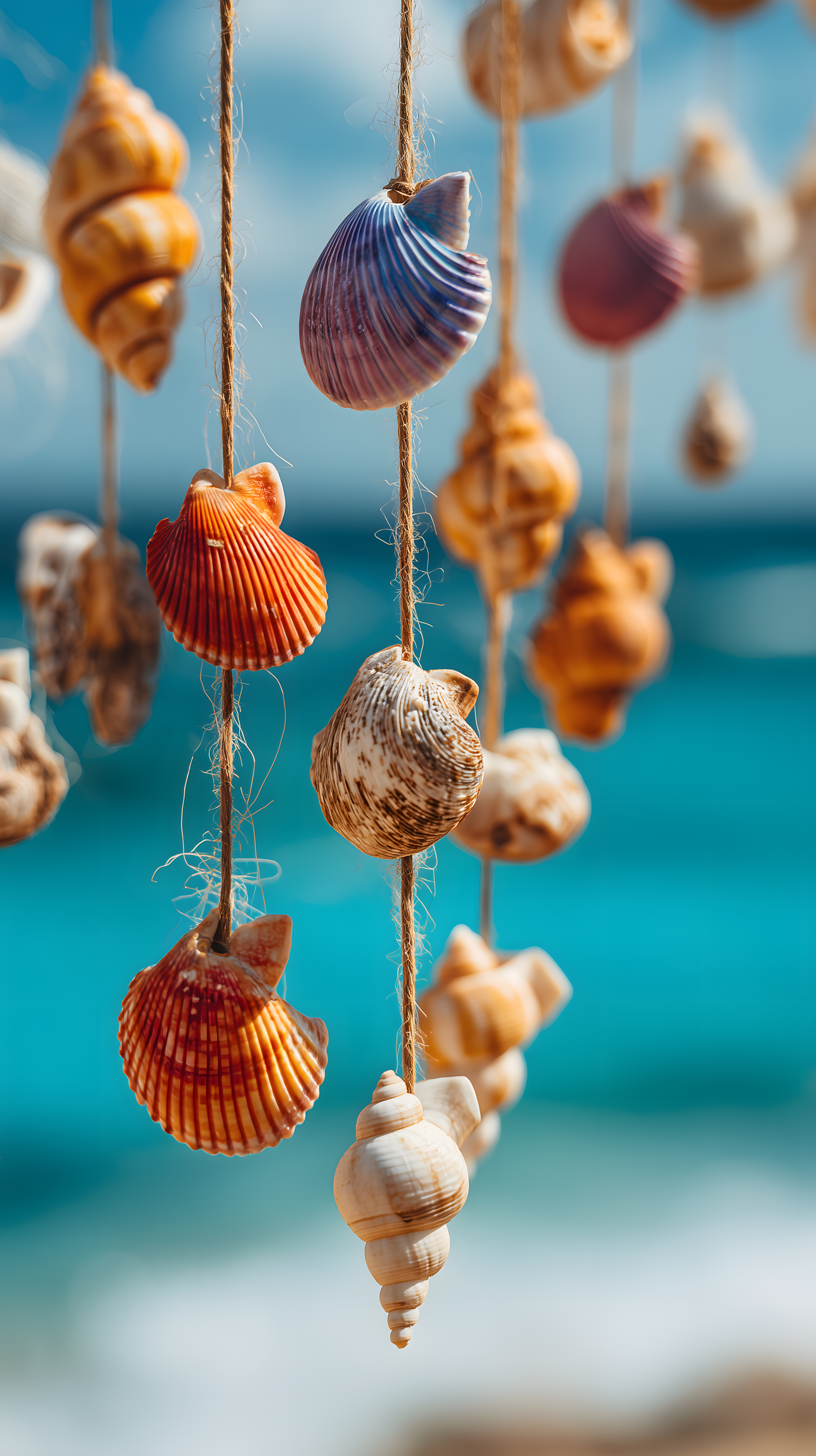 Detailaufnahme von hängenden Muschel-Windspielen mit Sonnenlicht