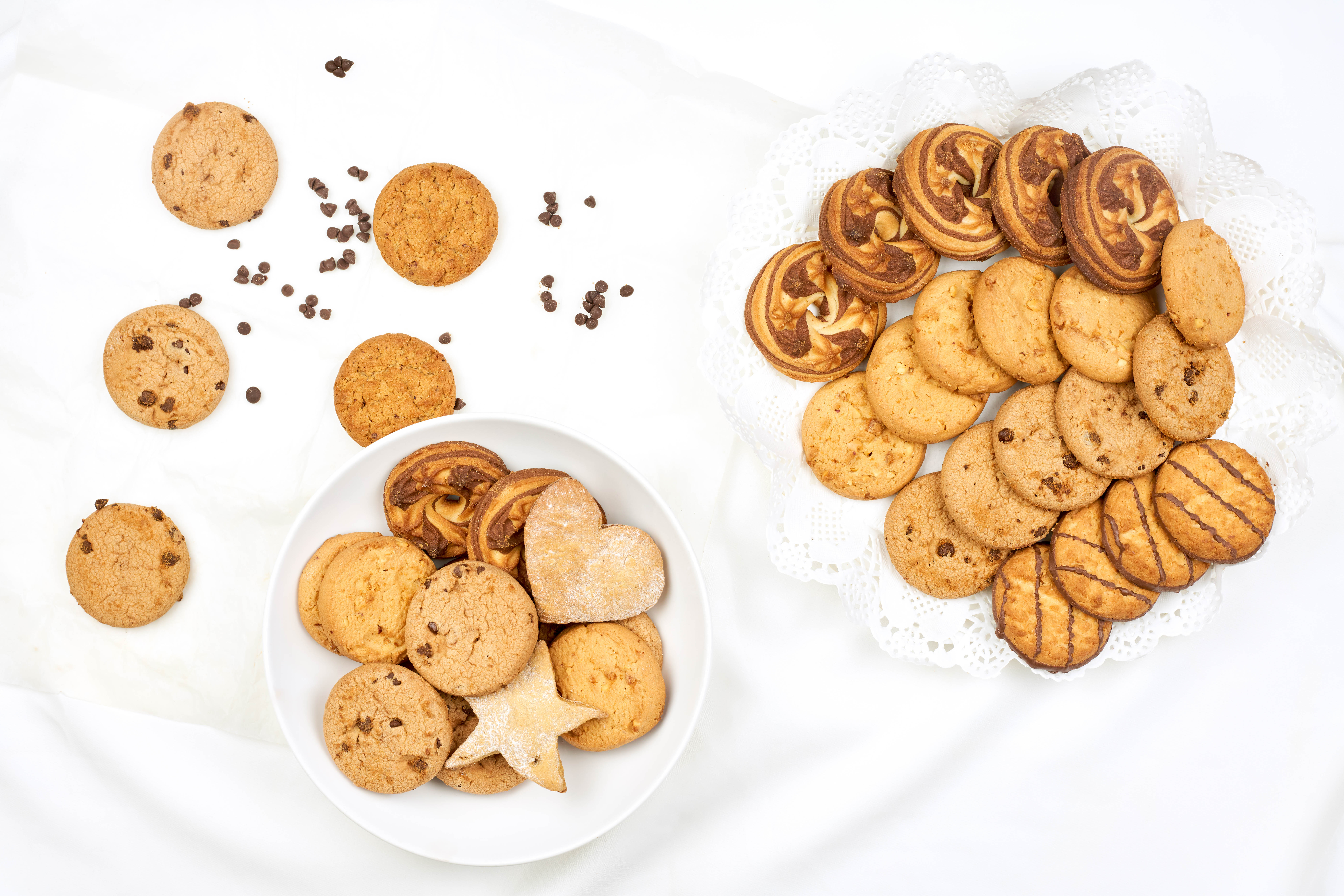 Different sweet cookies on pure white blanket