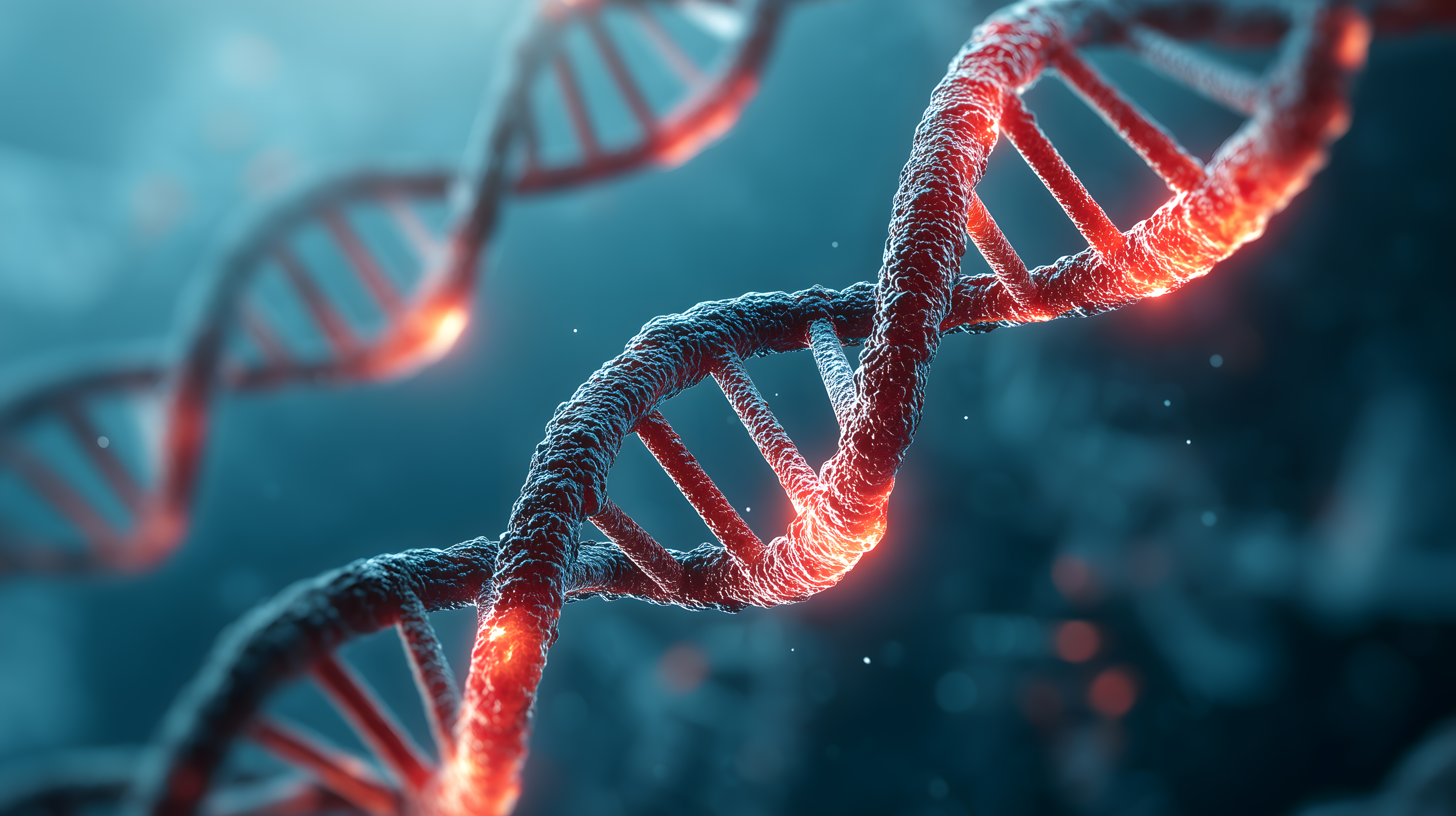 DNA Helix Nahaufnahme mit leuchtenden Strängen auf blauem Hintergrund