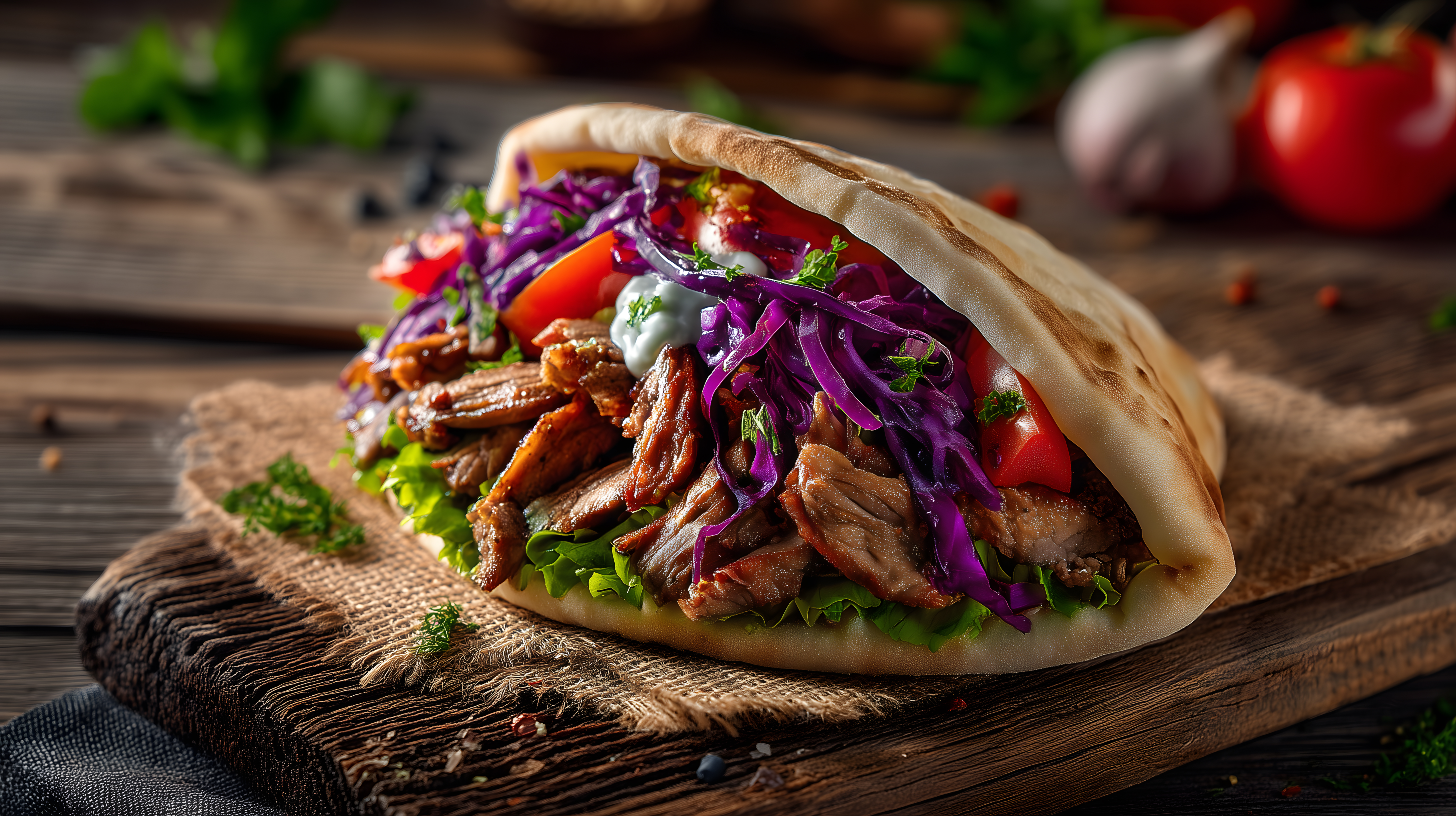 Döner Sandwich mit Fleisch und Rotkohl auf Holzbrett