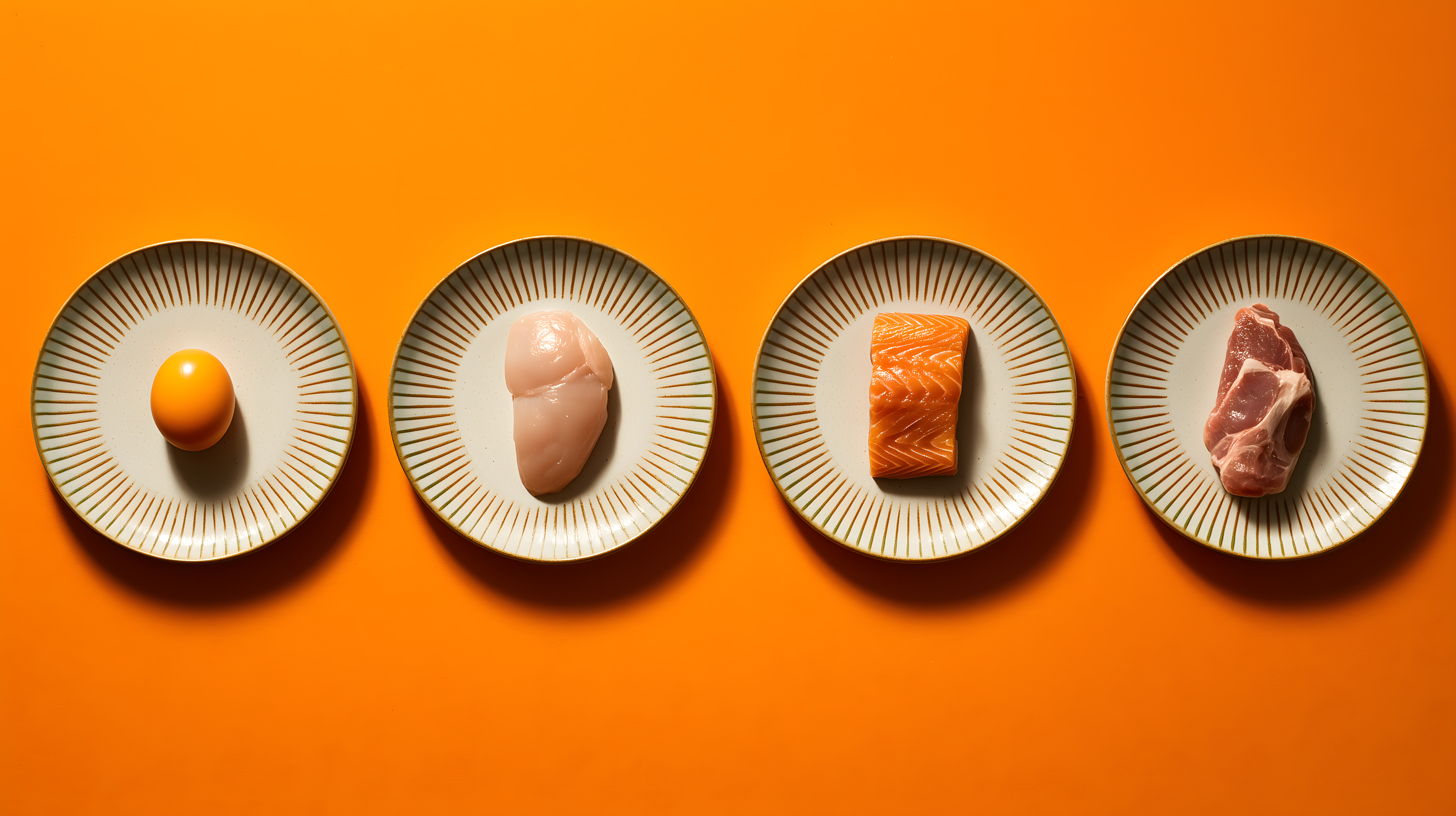 Ei, Hähnchen, Lachs und Schweinefleisch als Proteinquellen auf Tellern