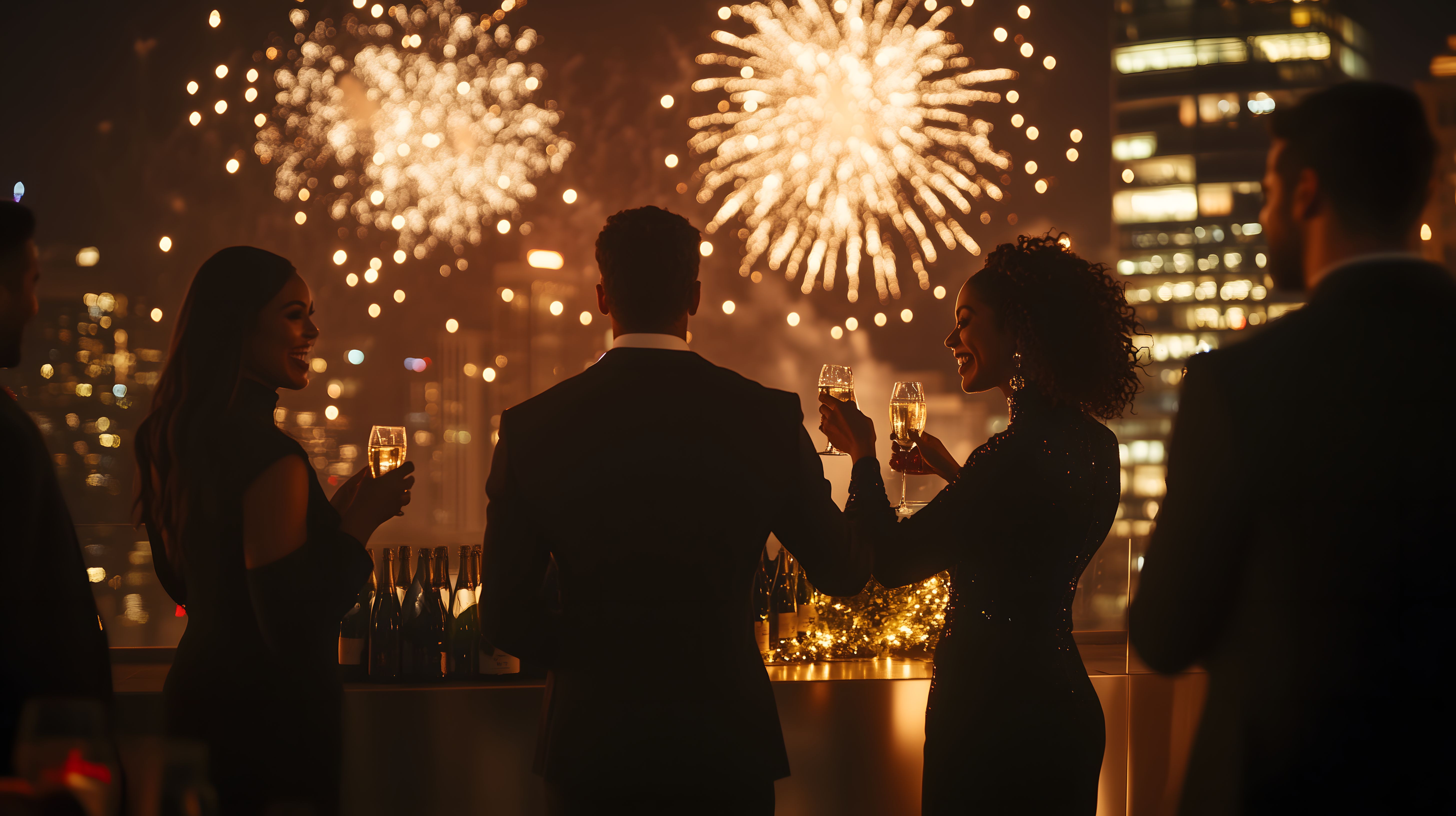 Elegante Silvesterfeier mit Feuerwerk und Champagner