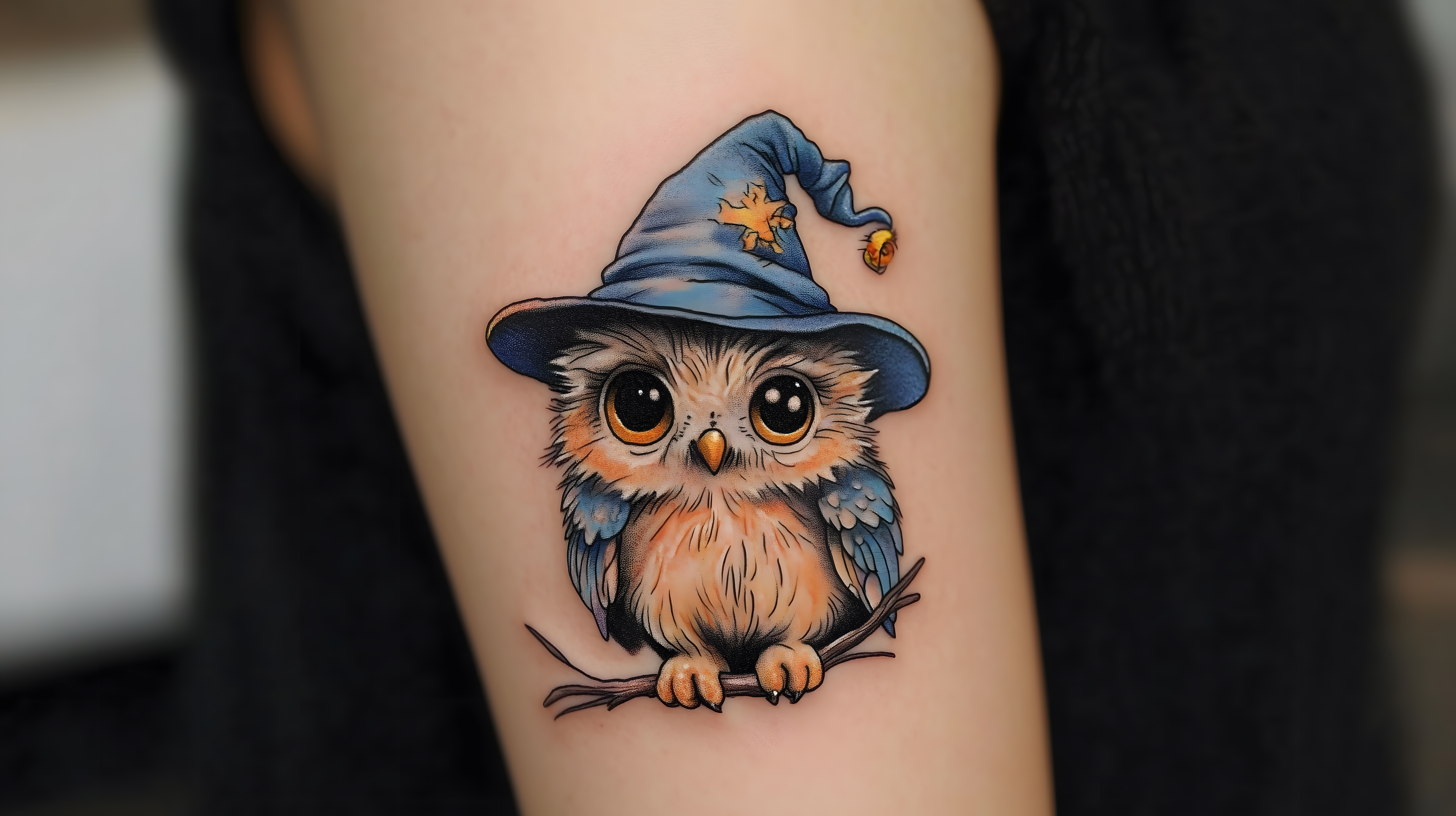 Eule Tattoo mit Hexenhut auf dem Arm im magischen Stil