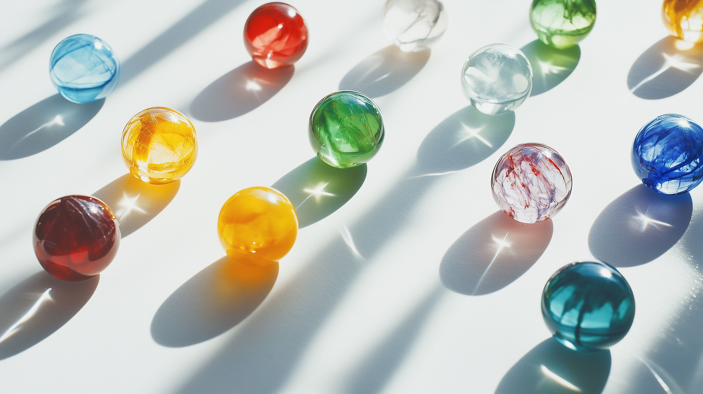 Farbige Murmeln verstreut auf weißem Hintergrund