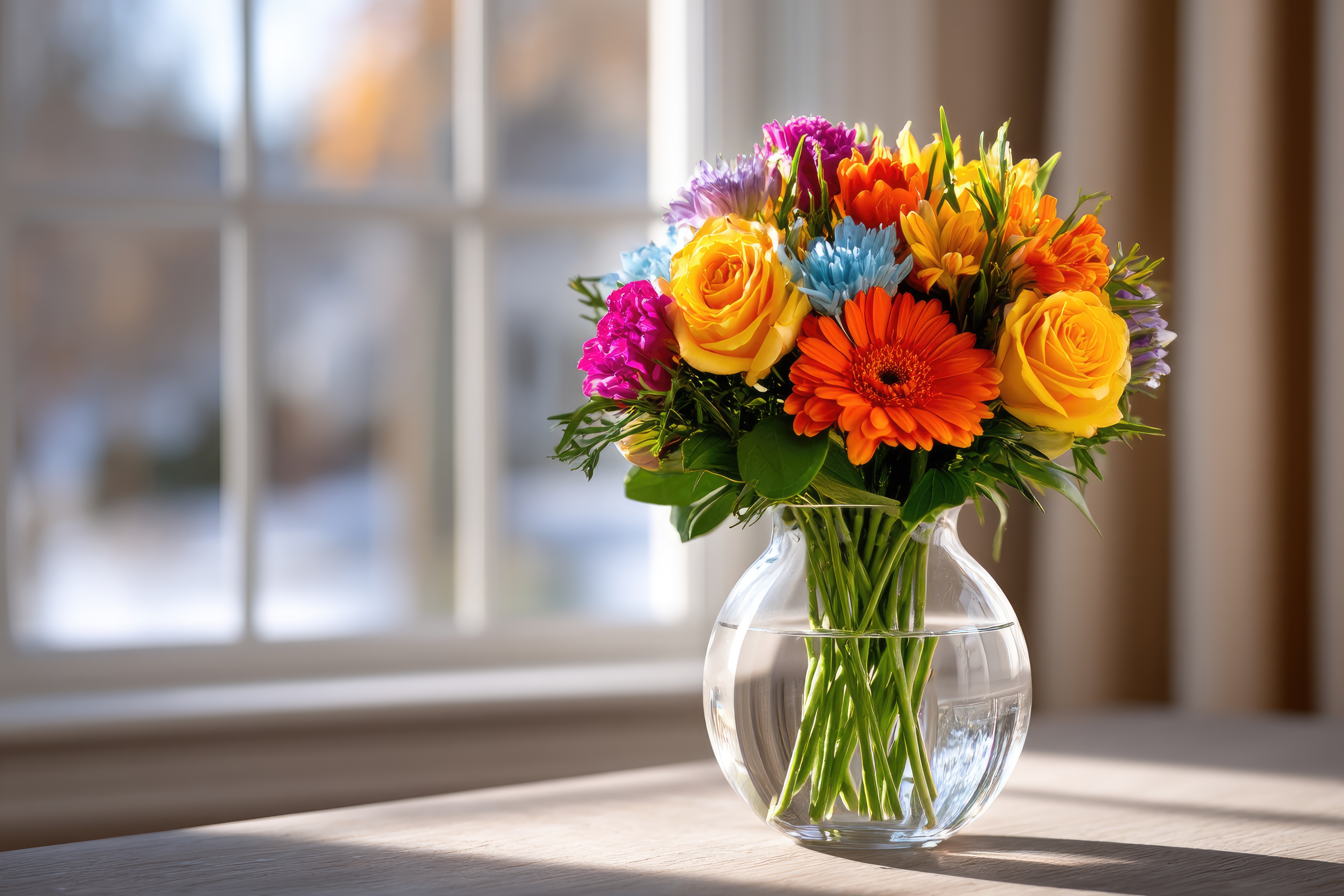 Farbiger Blumenstrauß in Vase vor Fenster