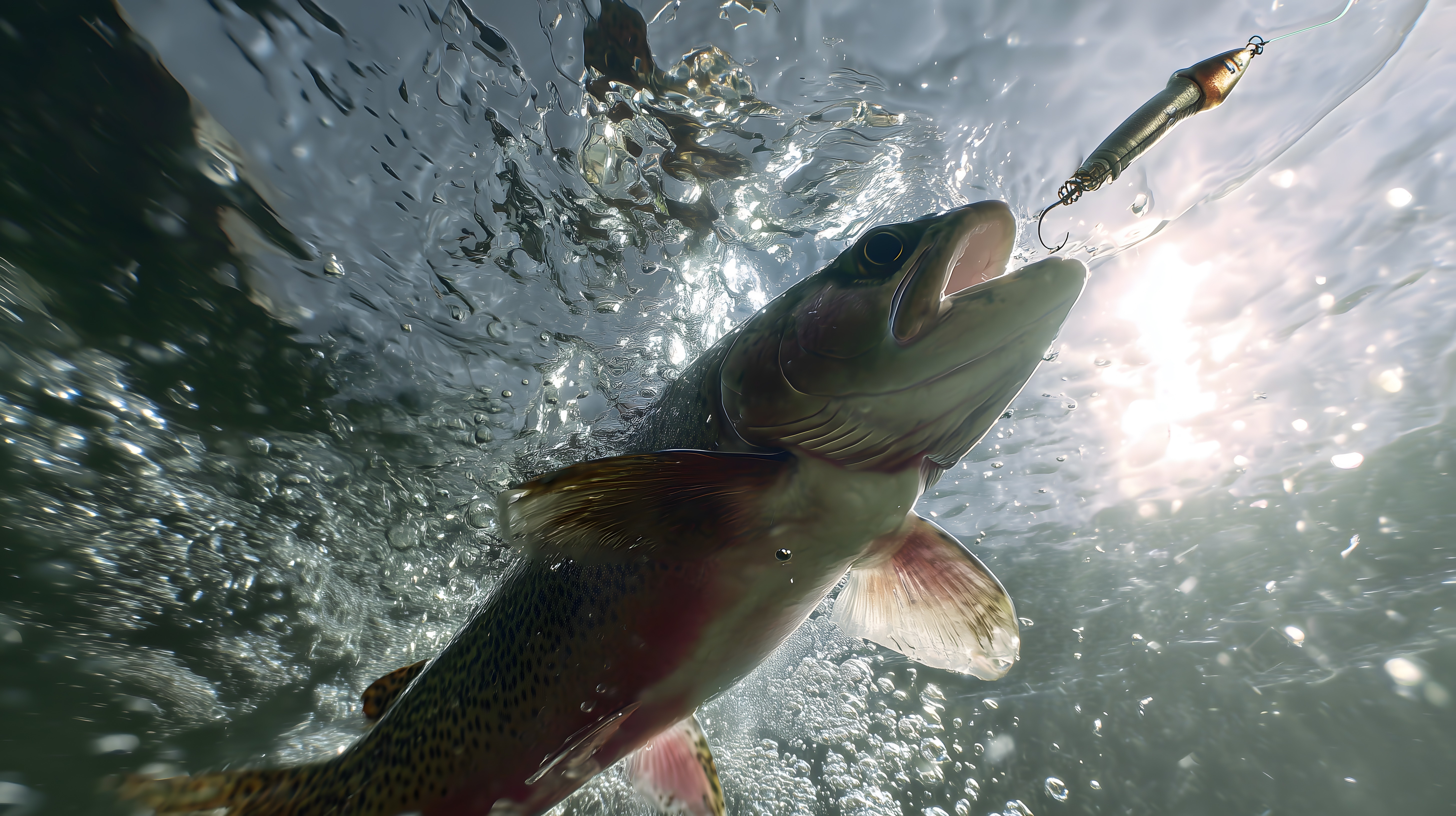 Fischfang: Forelle unter Wasser greift zum Köder