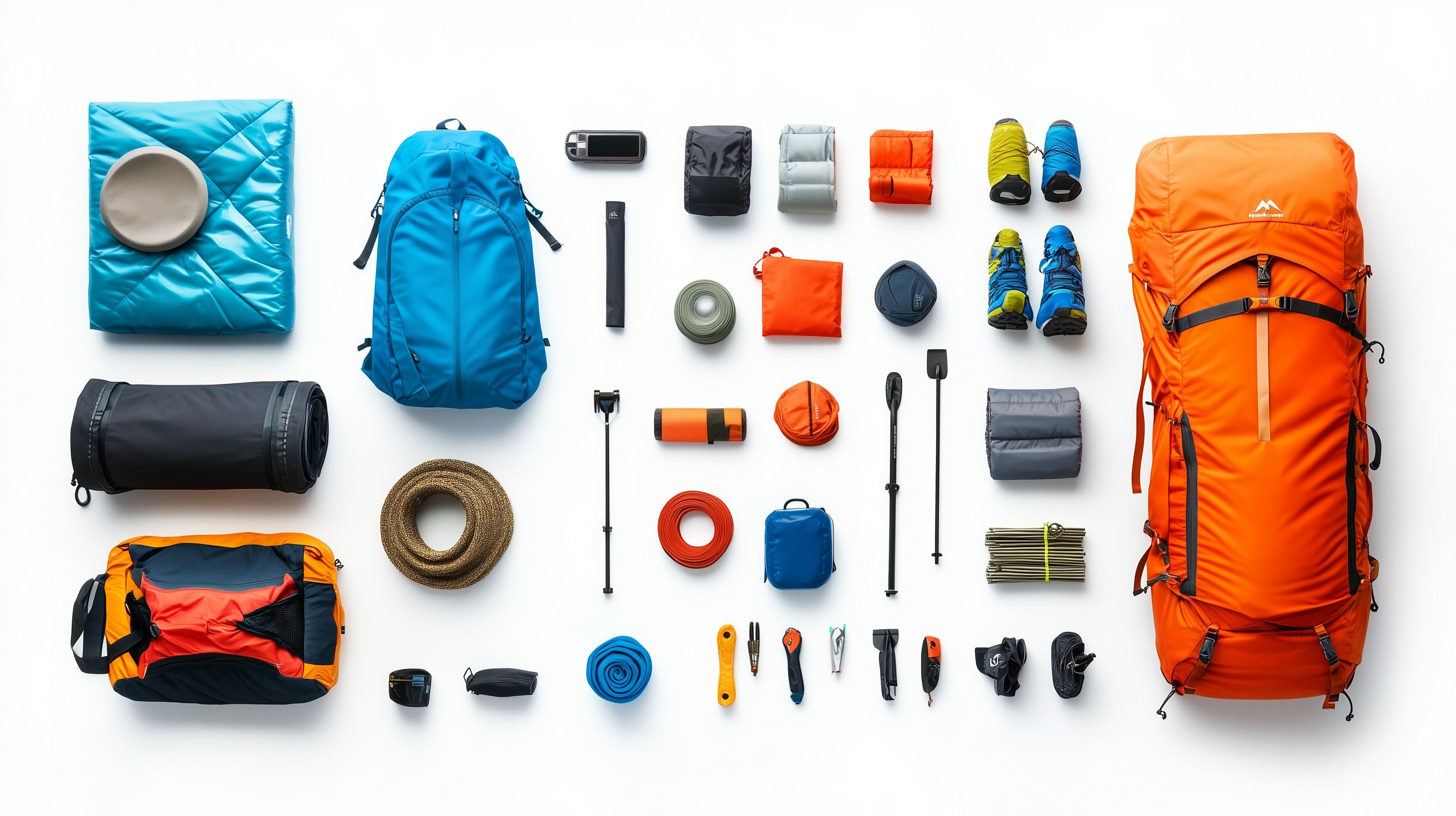 Flach gelegte Campingausrüstung in leuchtenden Farben auf weißem Hintergrund