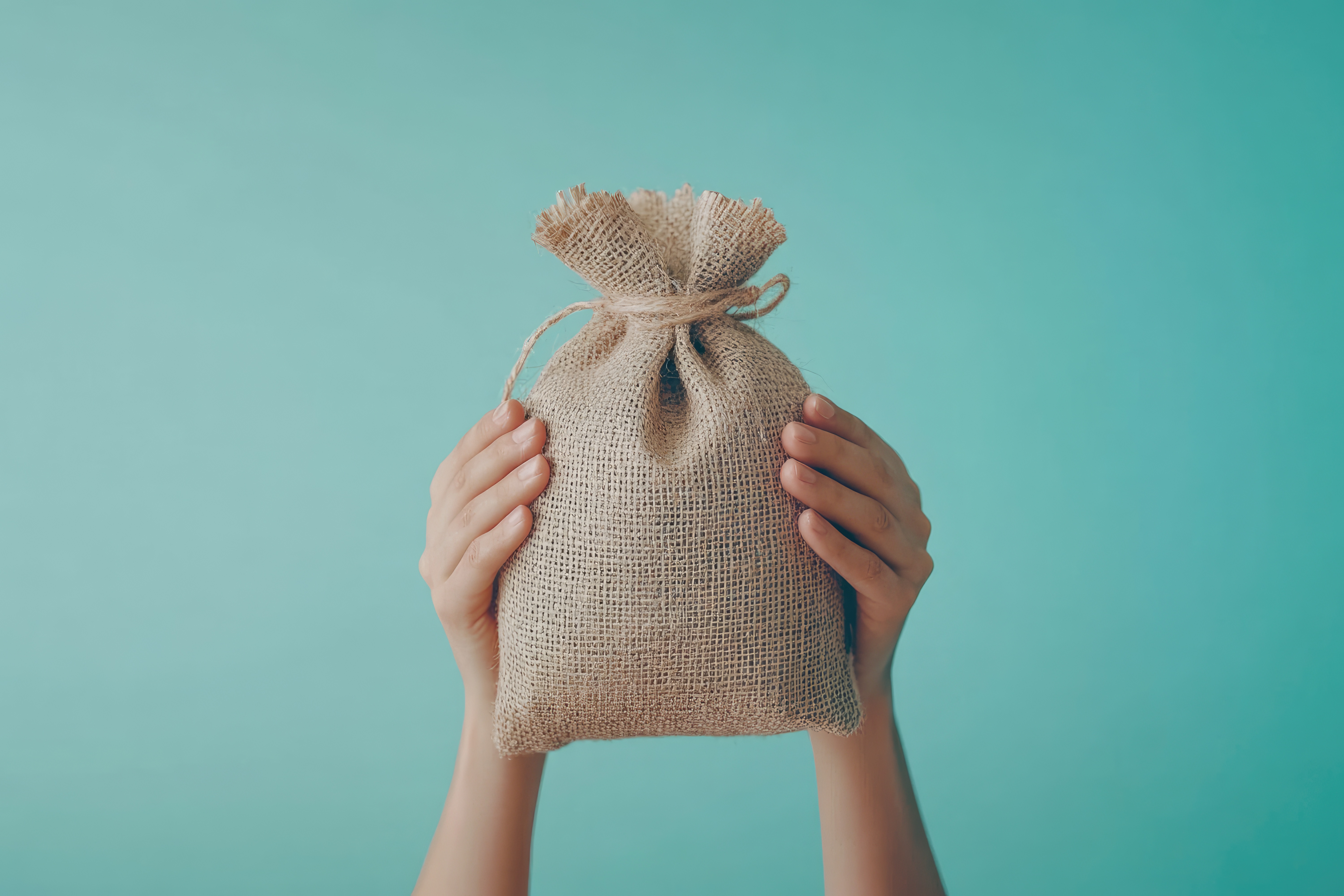 Frau hält einen Geldsack hoch