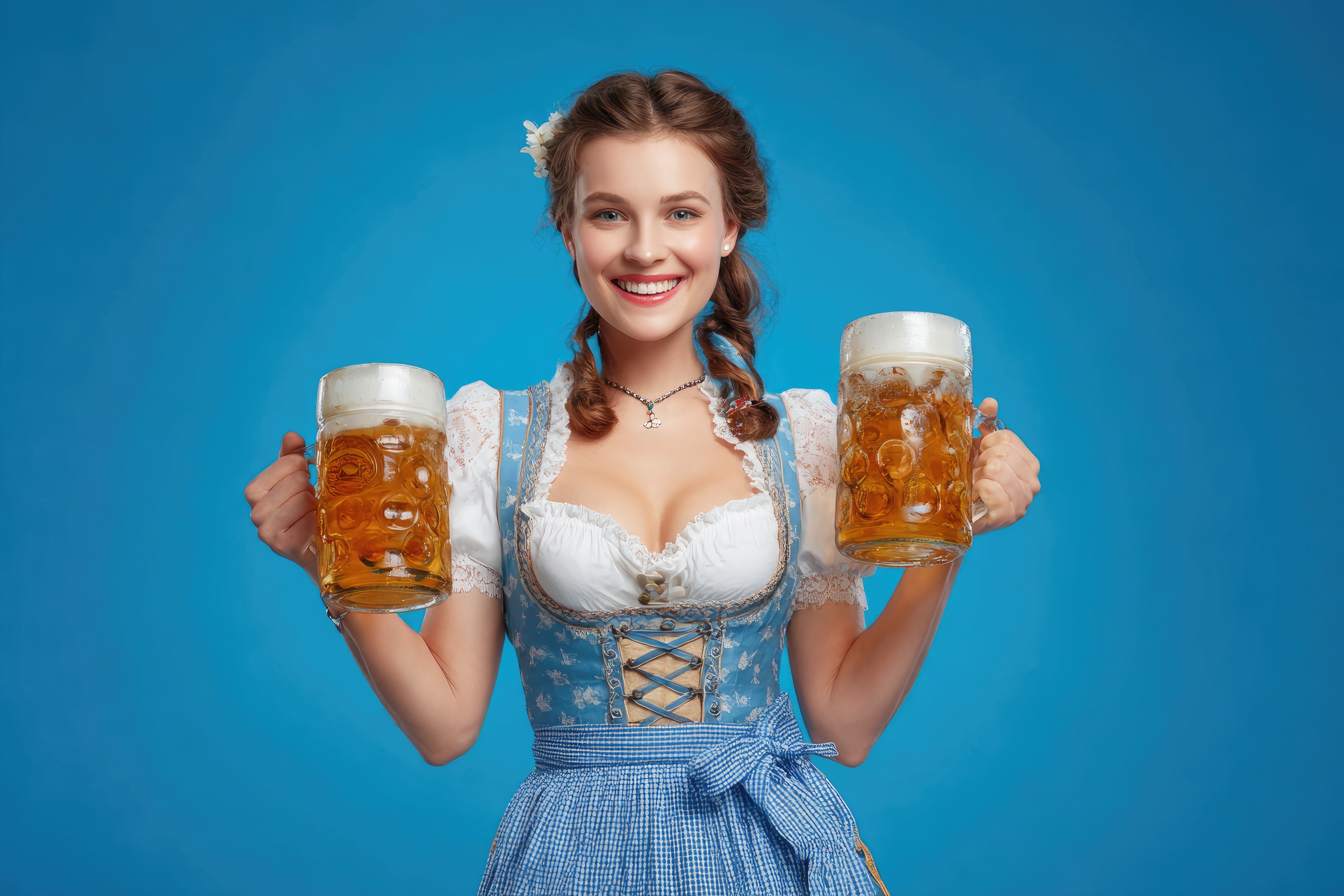 Frau in blauer Tracht mit Bierkrügen