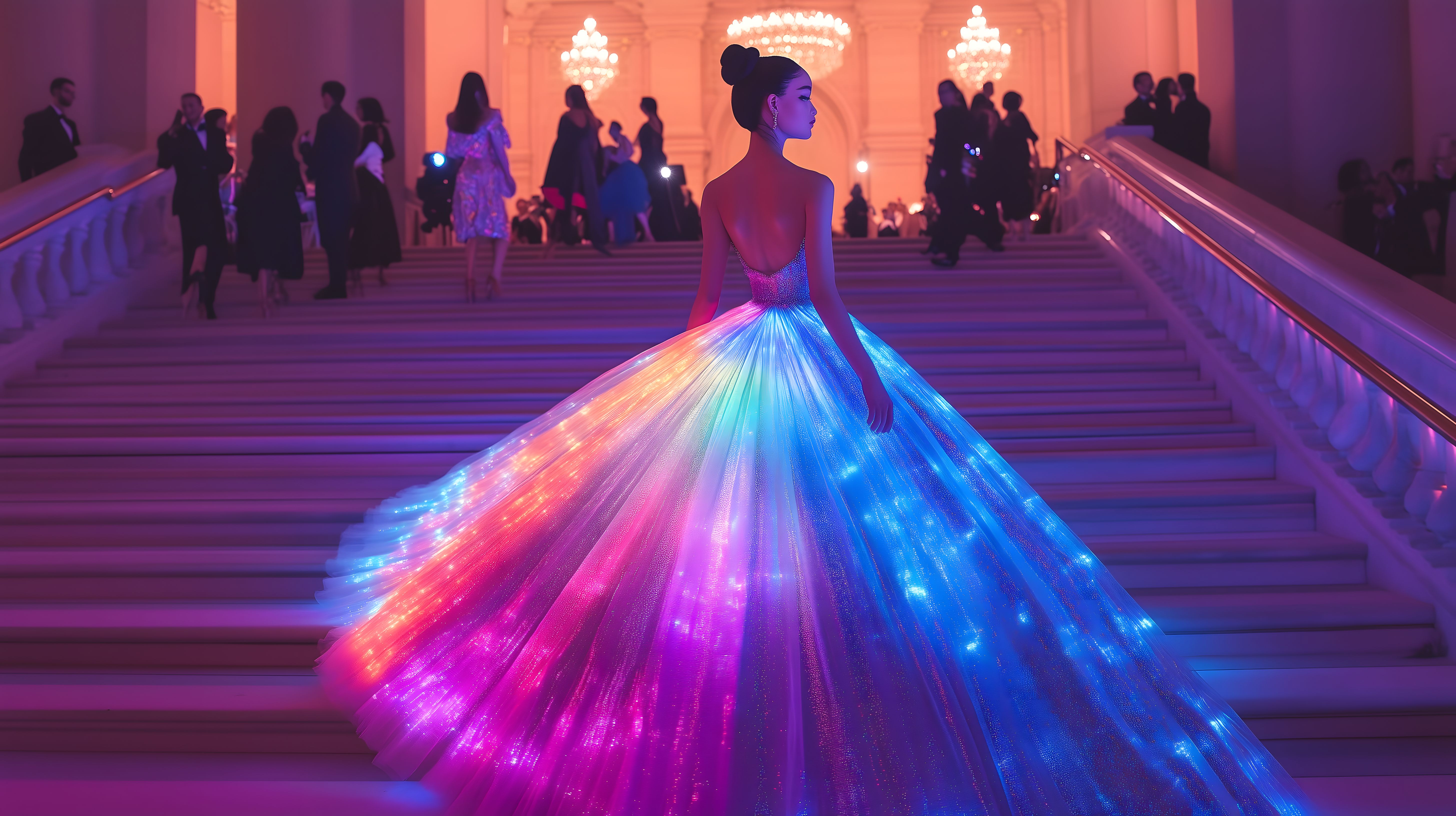 Frau in leuchtendem Ballkleid auf majestätischen Treppen